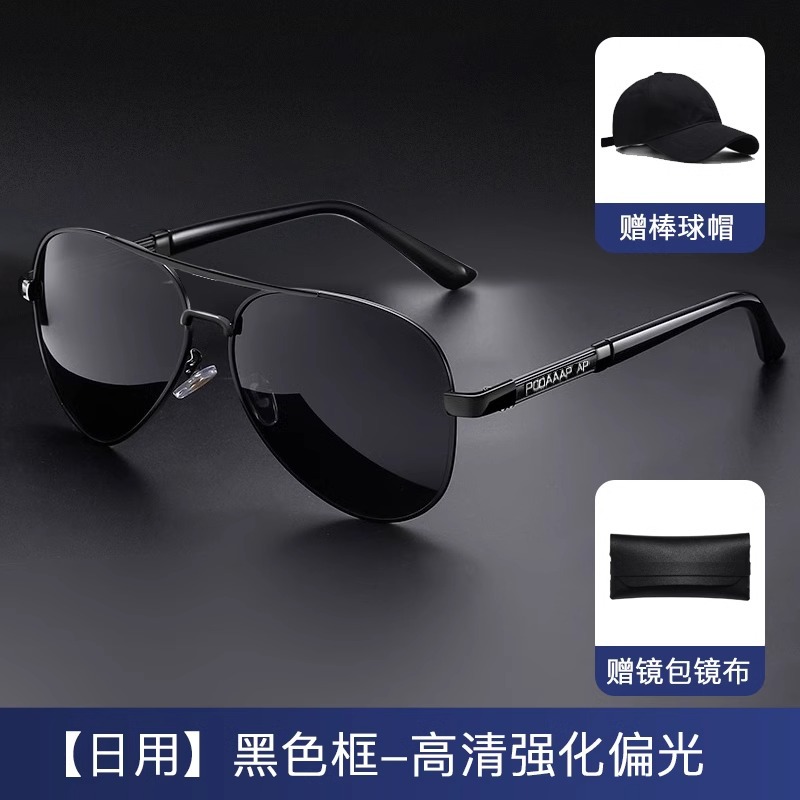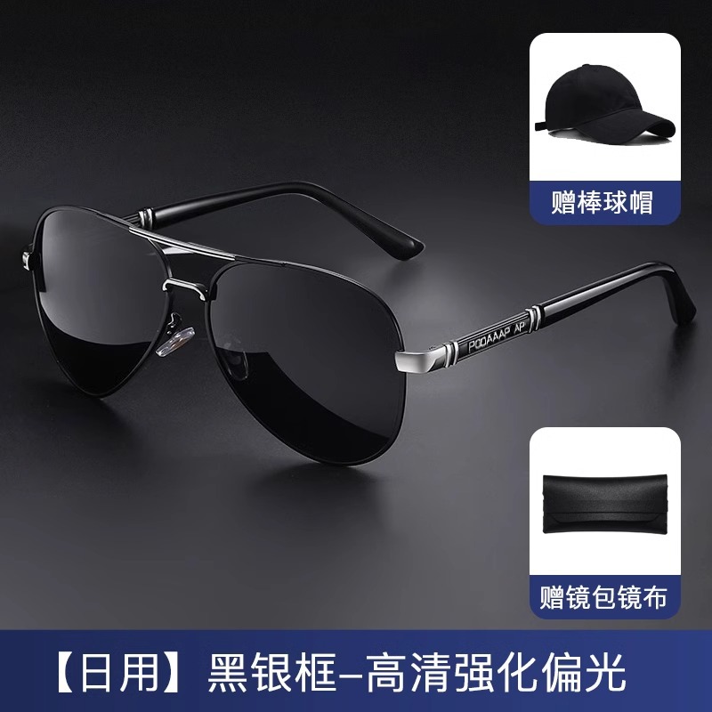 • [편광 눈 보호 및 눈부심 방지 - 주간 전용] 블랙 프레임, 실버 빔, 블랙 및 그레이 필름 + 야구 모자