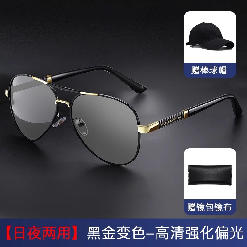 • [편광 눈 보호 및 눈부심 방지 - 주야간 사용] 블랙 프레임 골드 빔 색상 변경 필름 + 야구 모자