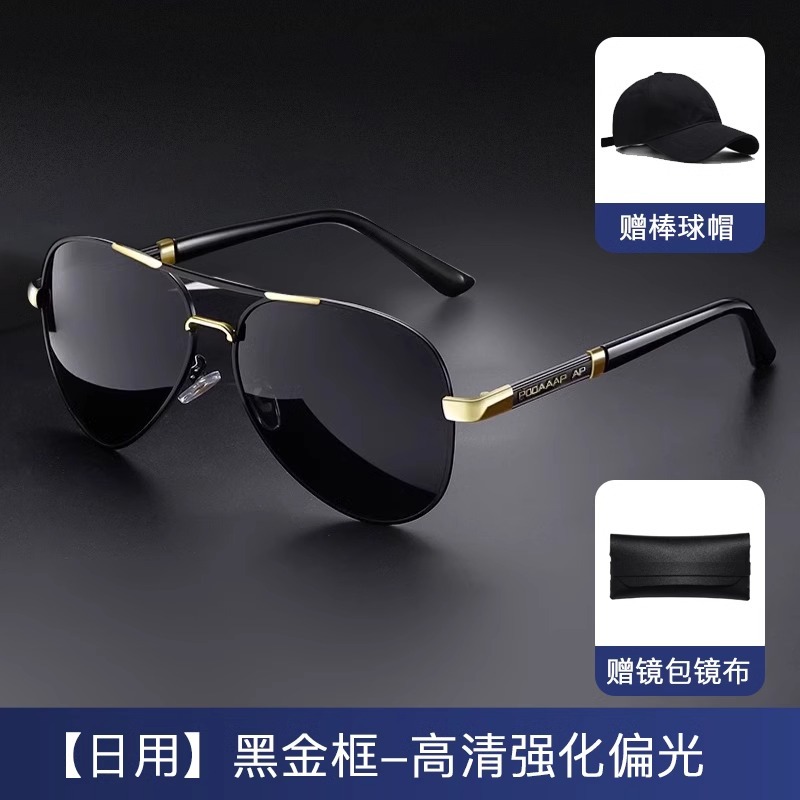• [편광 눈 보호 및 눈부심 방지 - 주간 전용] 블랙 프레임 골드 빔 블랙 그레이 필름 + 야구 모자
