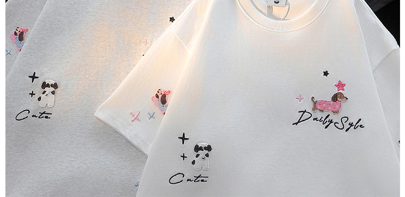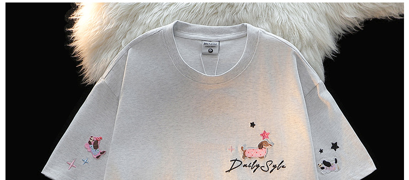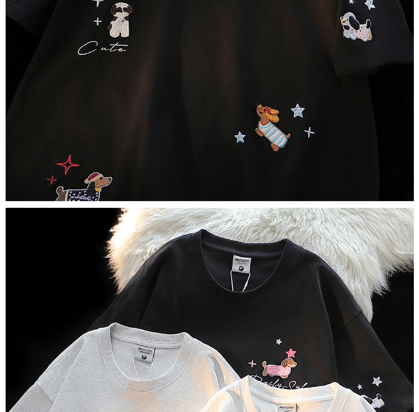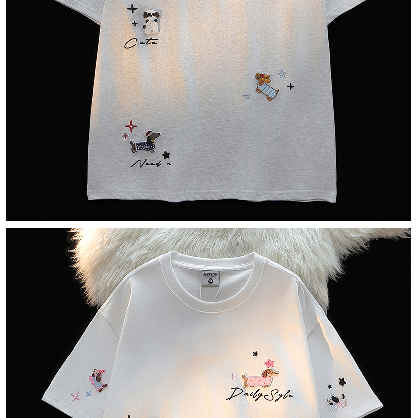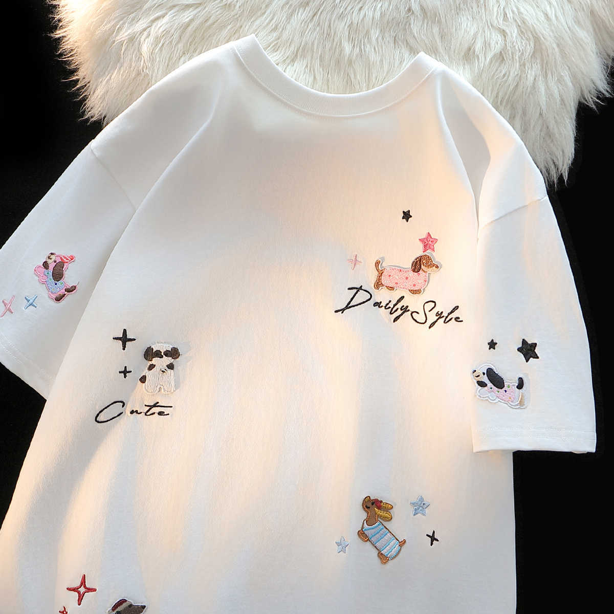 아메리칸 스타일 게으른 세련된 자수 강아지 반팔 티셔츠 여성용 퓨어 코튼 여름 커플 느슨한 반팔 귀여운 탑스토어 가기