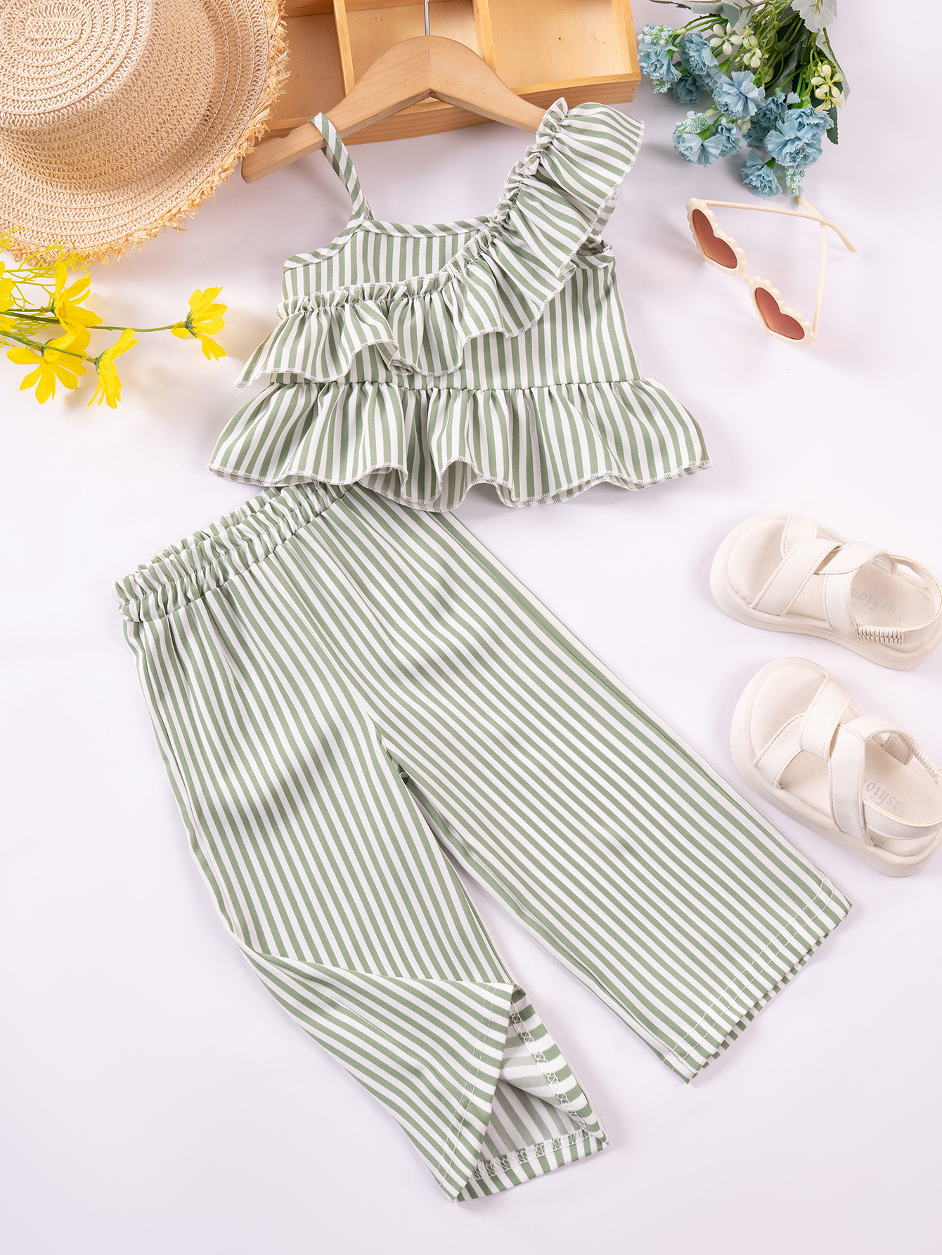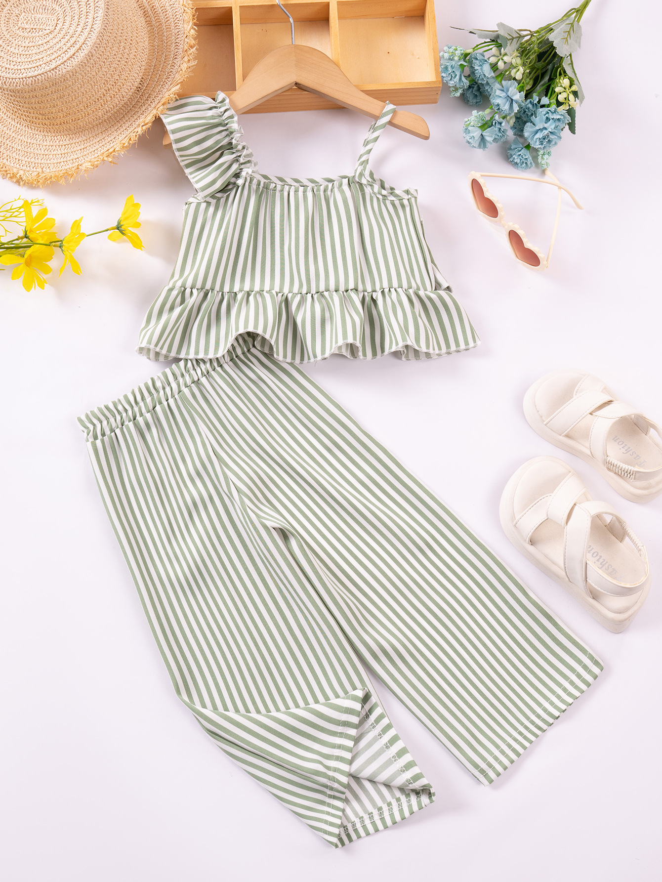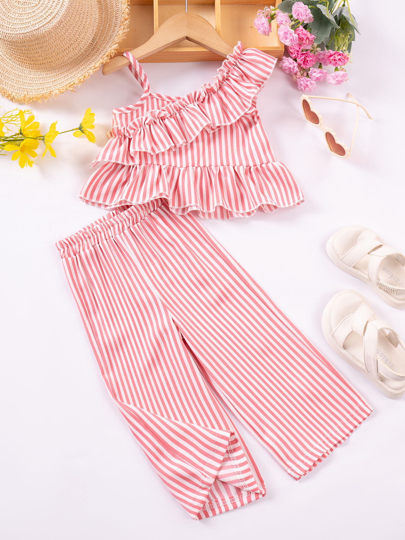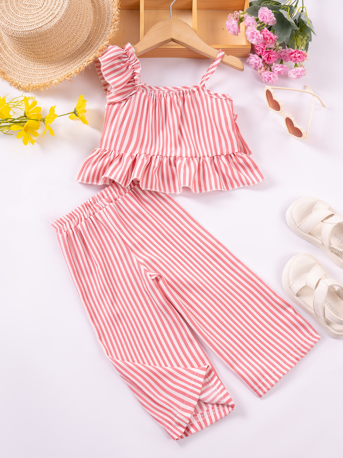 아동복 여름 새로운 패션 디자인 소녀의 줄무늬 슬링 탑 반바지 2 조각 세트 2025 새로운 크로스-보더스토어 가기