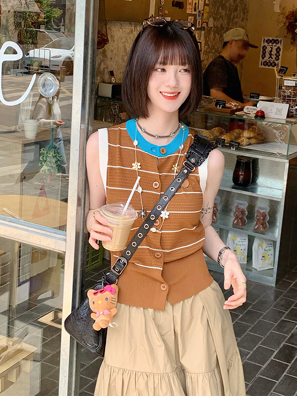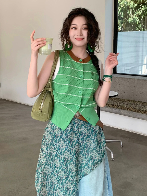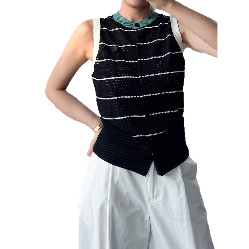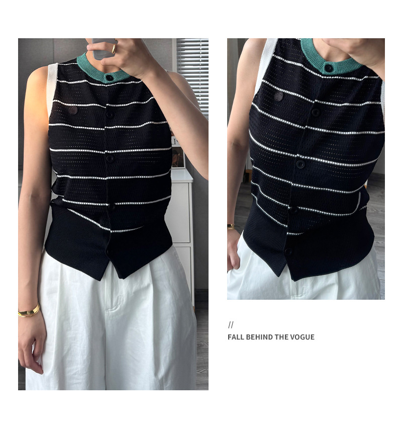 2026년 초봄 신상 레트로 배색 스트라이프 니트 조끼 여성용 허리라인 강조 민소매 숏 조끼