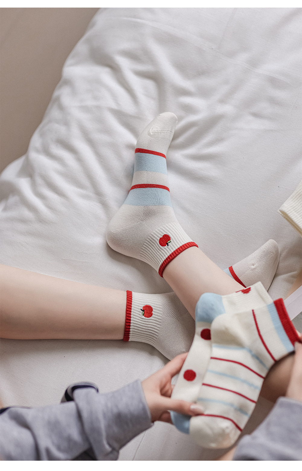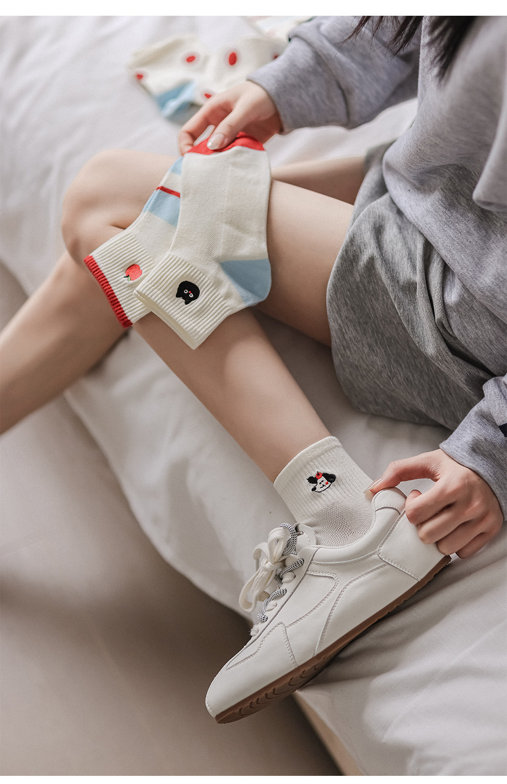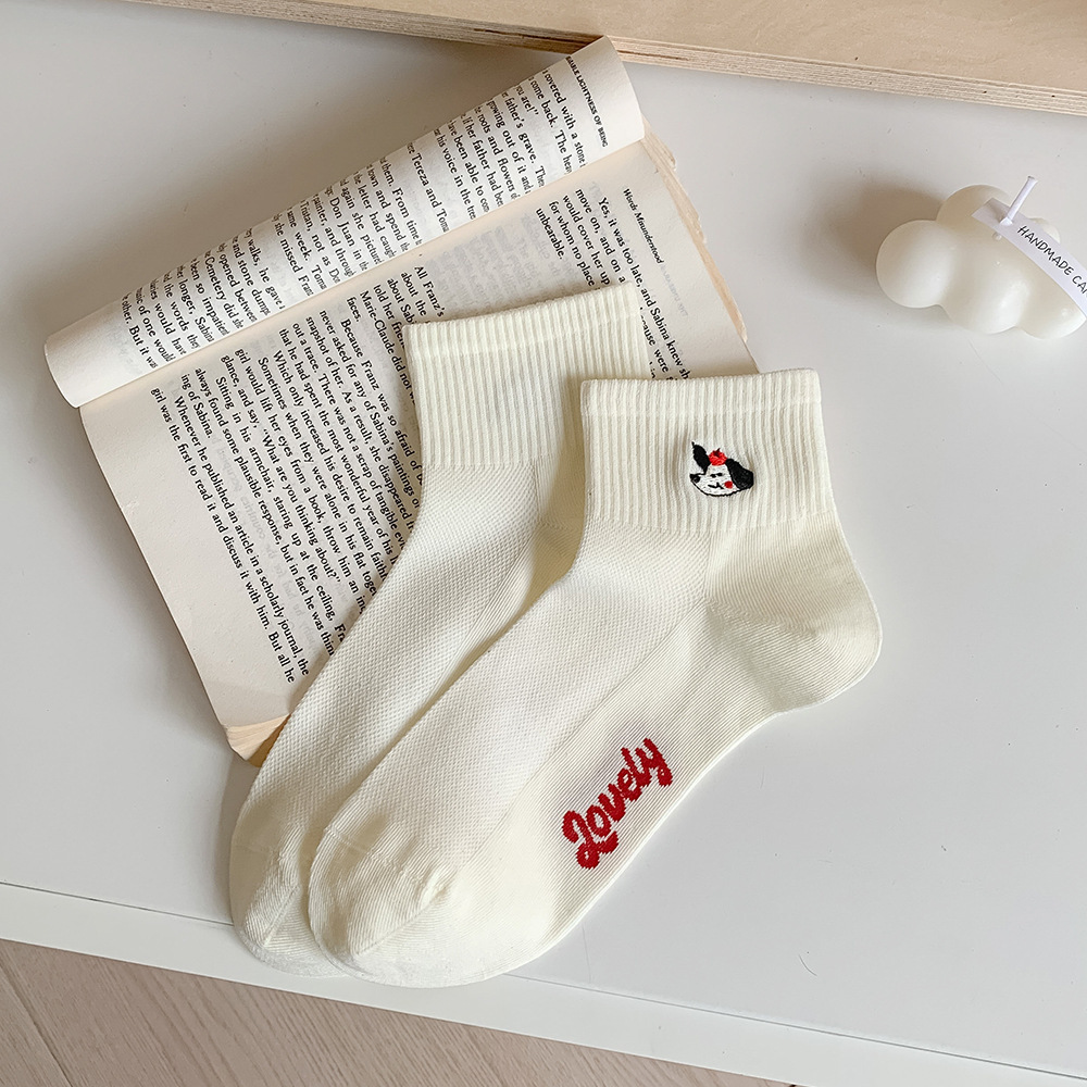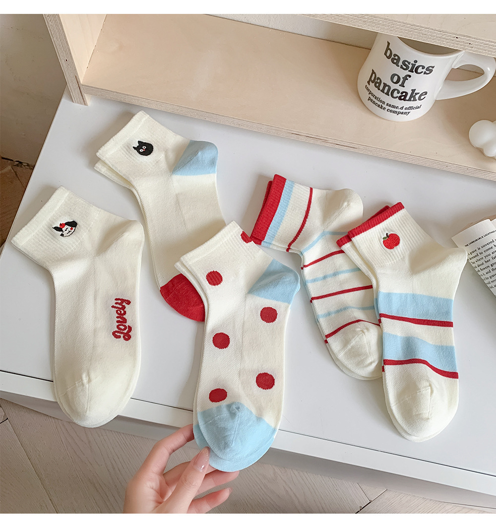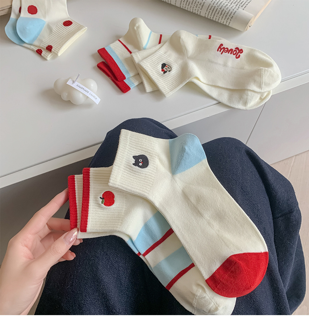 봄과 여름 귀여운 만화 자수 여성 양말 일본 스타일 대학 스타일 코튼 양말 올 매치 컬러 대비 폴카 도트 여성용 양말