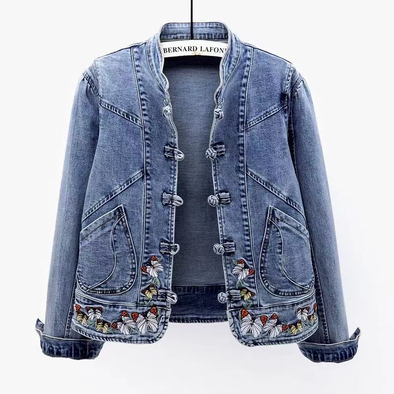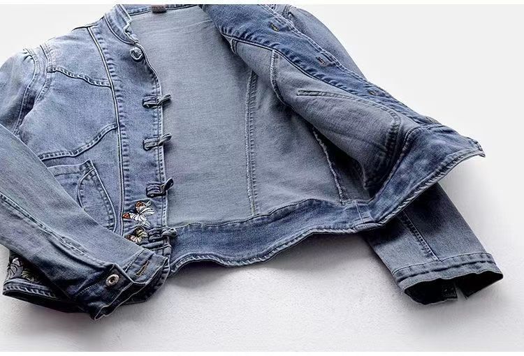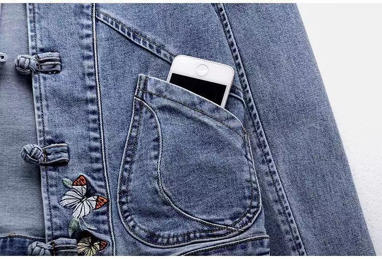 여성을위한 복고풍 중국 스타일 수 놓은 스트레치 짧은 데님 재킷 봄, 가을, 겨울 2023 새로운 재킷 루즈 탑