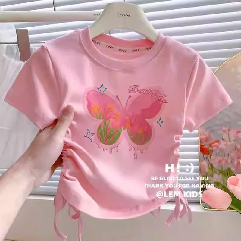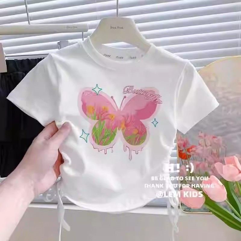 소녀 아이스 실크 반팔 2025 여름 새로운 스타일 여성 아기 얇은 만화 귀여운 나비 드로우 스트링 반팔 티셔츠스토어 가기