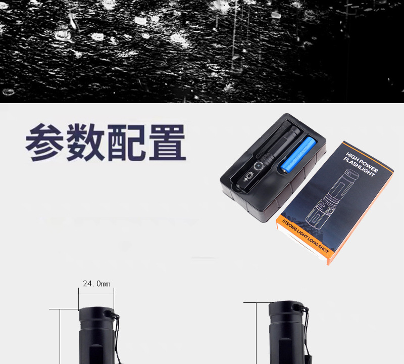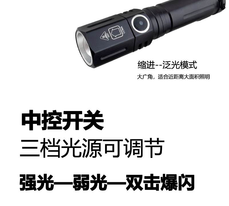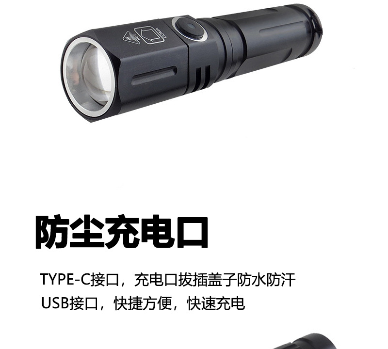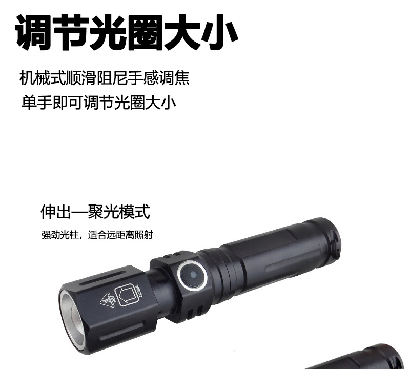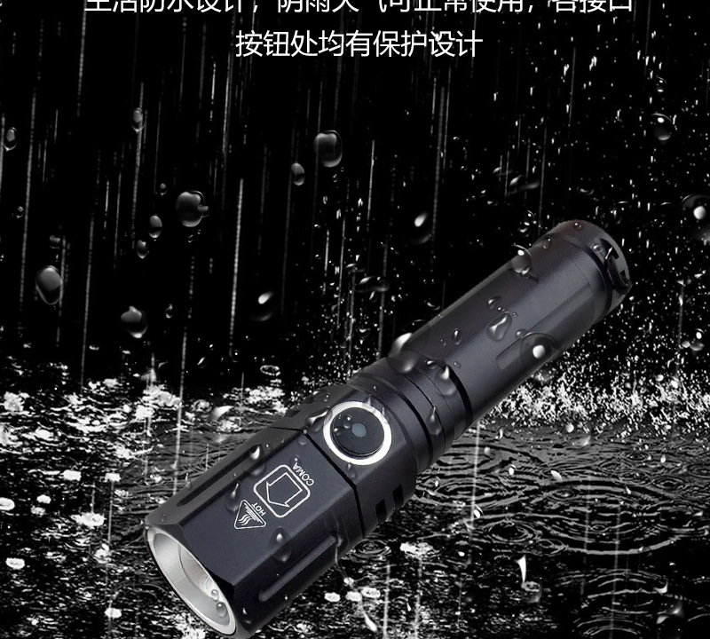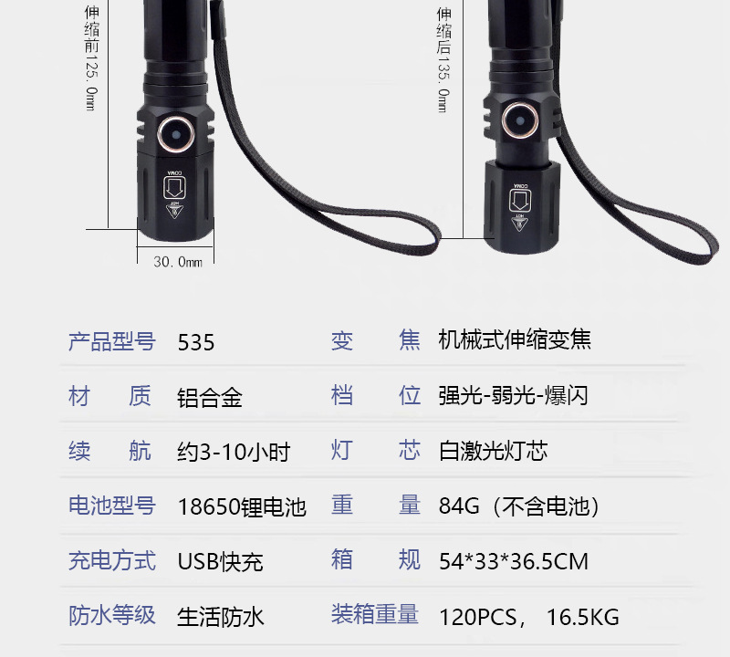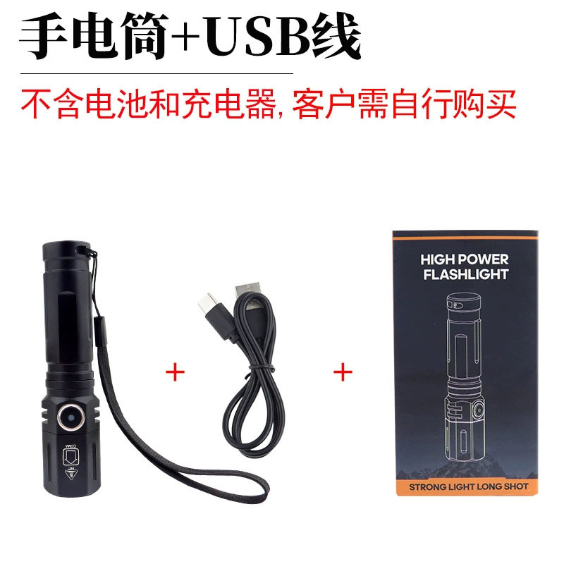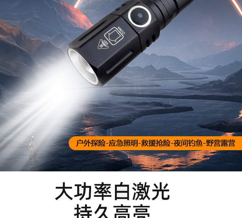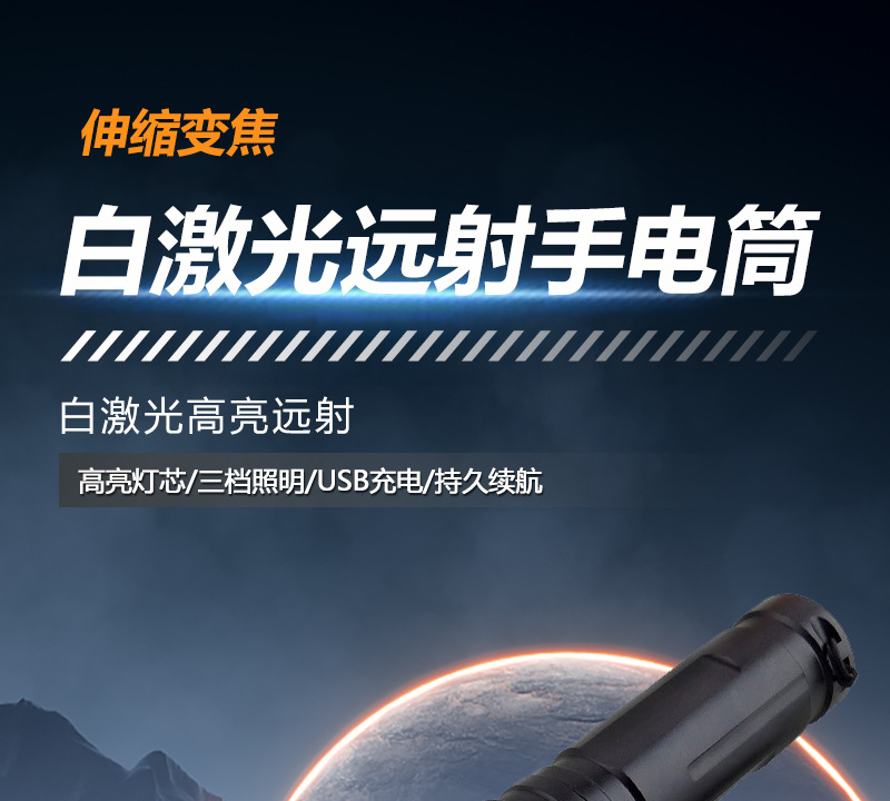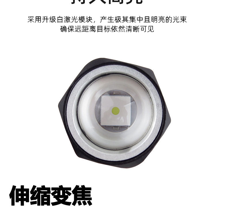 국경 간 새로운 강한 빛 손전등 LED 흰색 레이저 줌 충전식 야외 비상 조명 미니 손전등