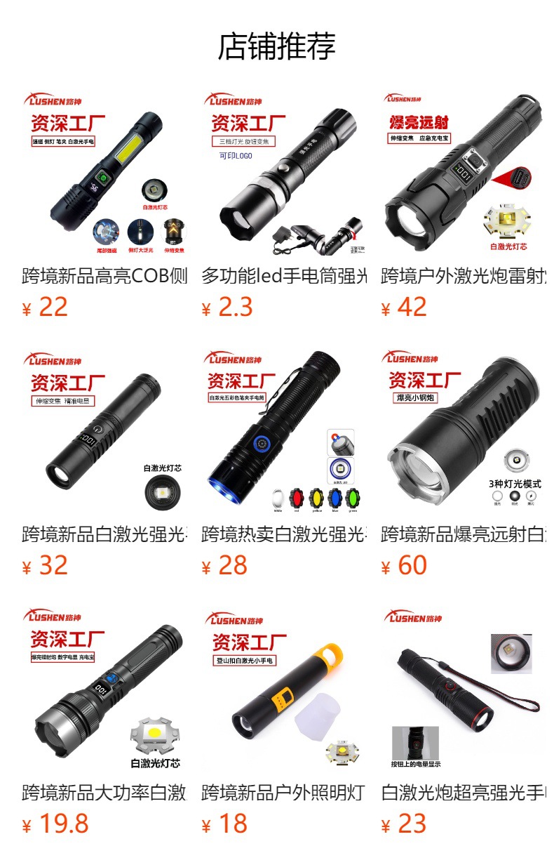 국경 간 새로운 강한 빛 손전등 LED 흰색 레이저 줌 충전식 야외 비상 조명 미니 손전등스토어 가기
