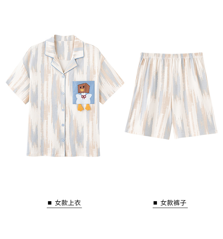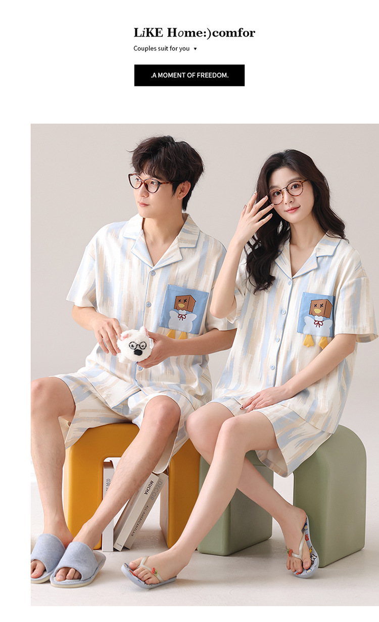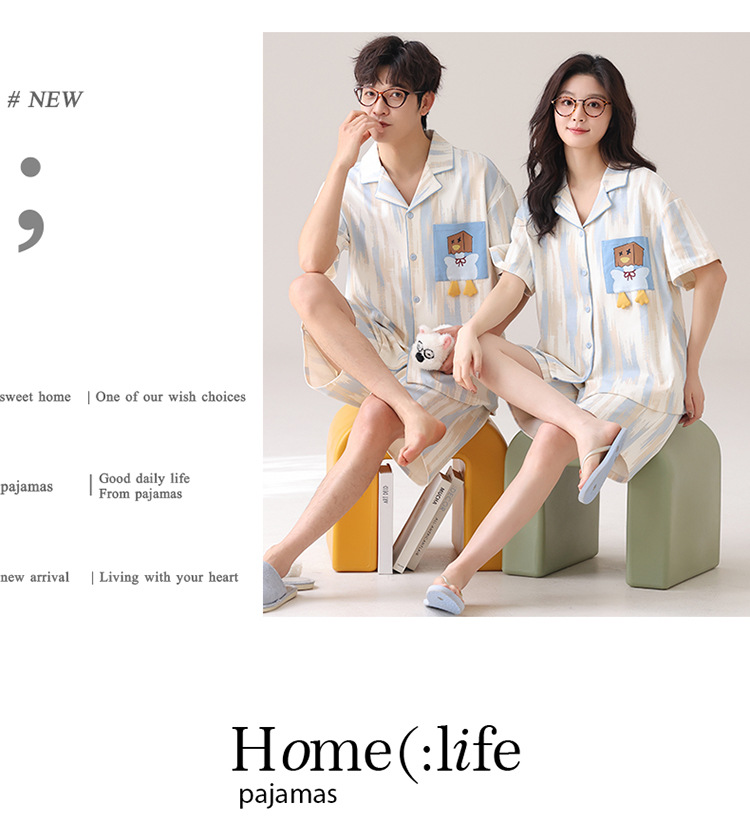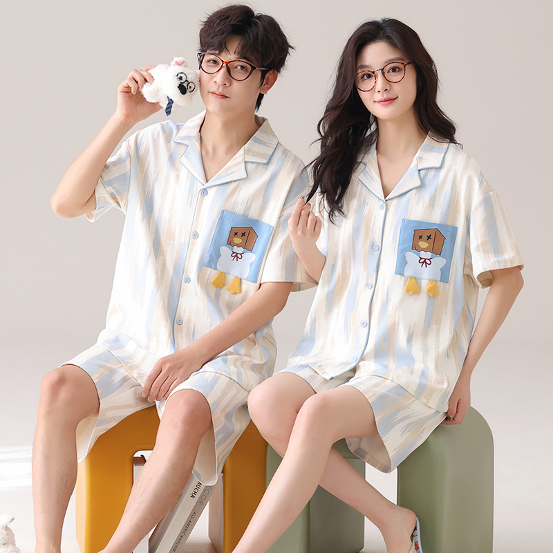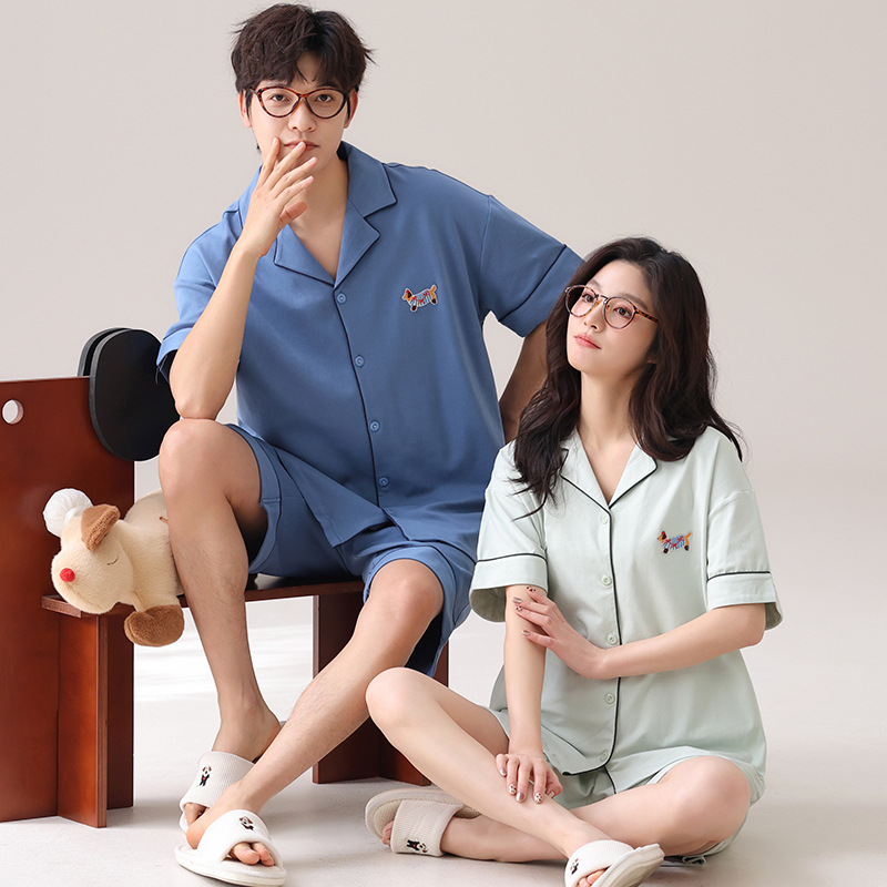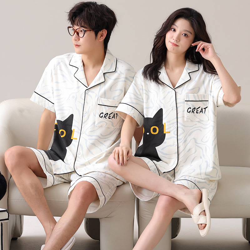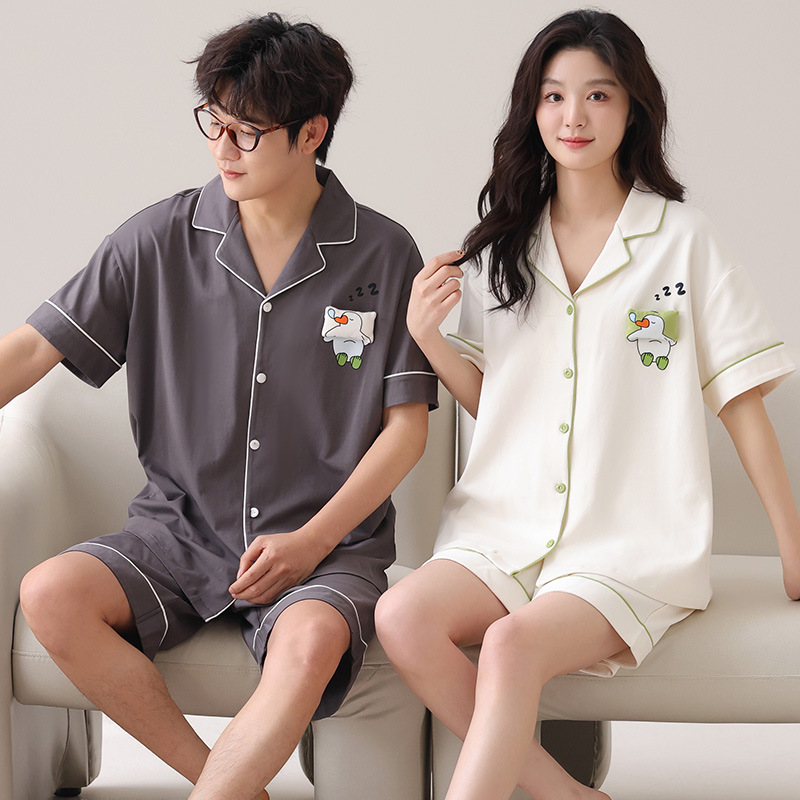새로운 여름 커플 잠옷 면 반팔 만화 남성과 여성의 옷깃 얇은 홈 옷 투피스 세트스토어 가기