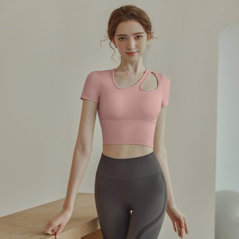 알몸 피부 친화적 인 봄 새로운 반팔 스포츠 피트니스 가슴 패드 고급 티셔츠가있는 필라테스 요가 세트 탑