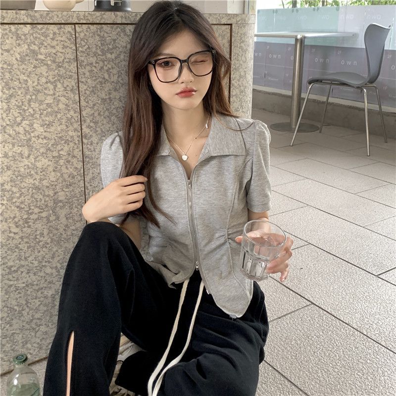 디자인 센스 니쉬 지퍼 폴로 칼라 반팔 티셔츠 여성 2025 년 여름 스파이스 소녀 불규칙한 슬리밍 쇼트 탑