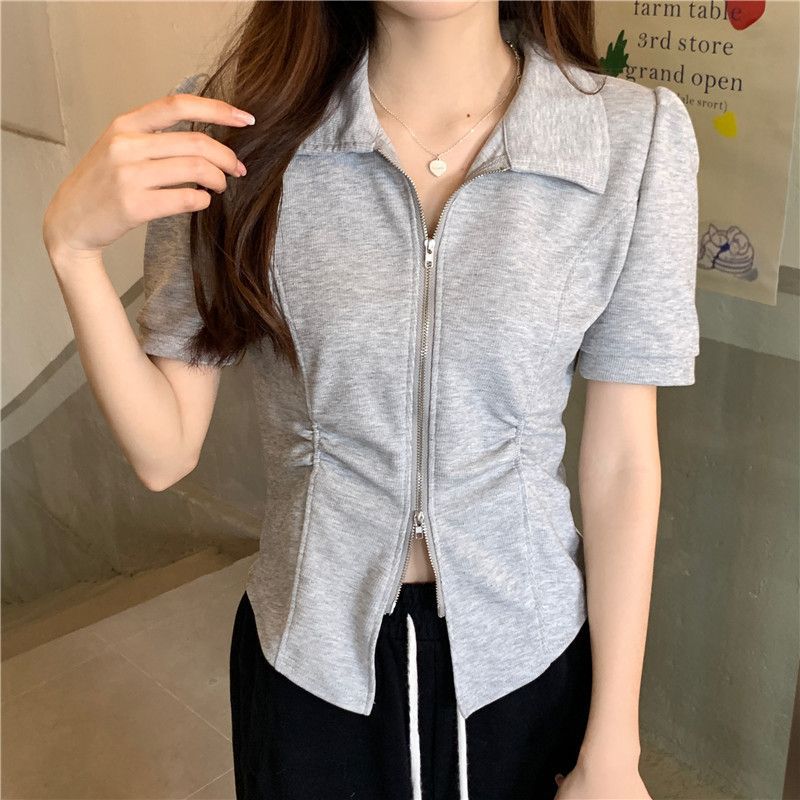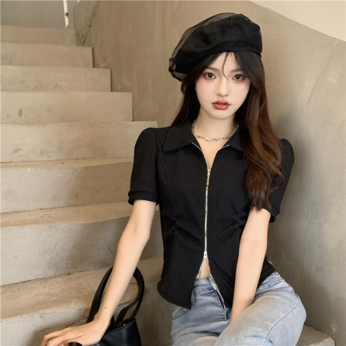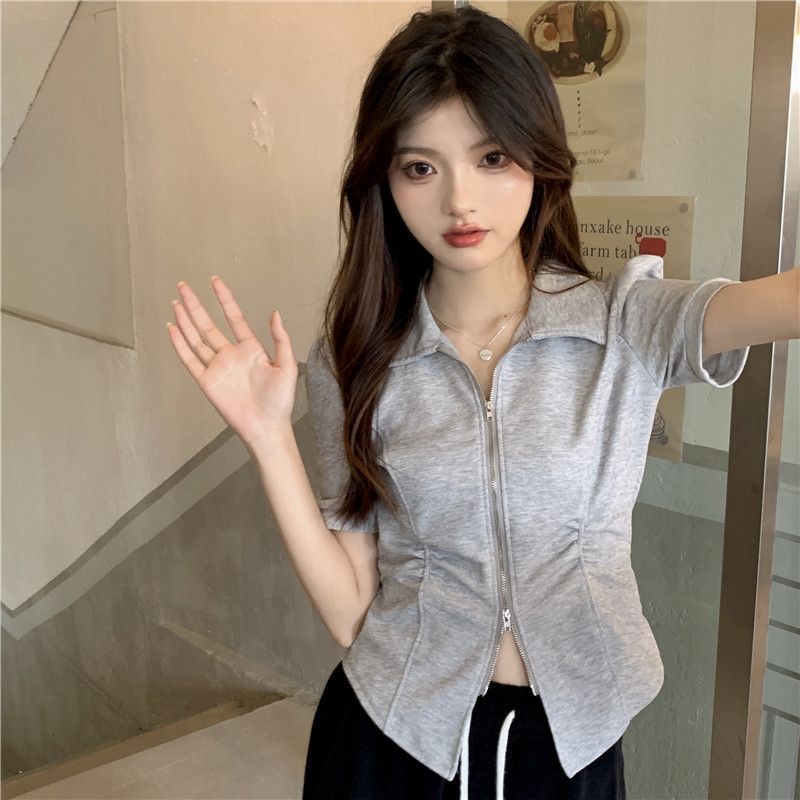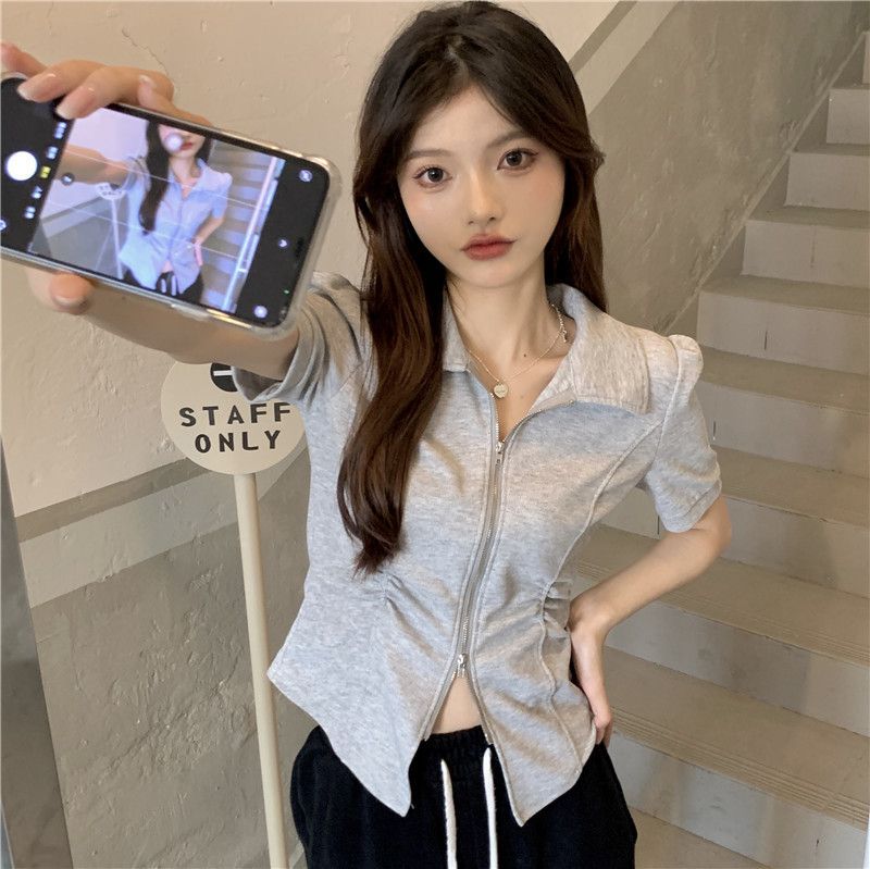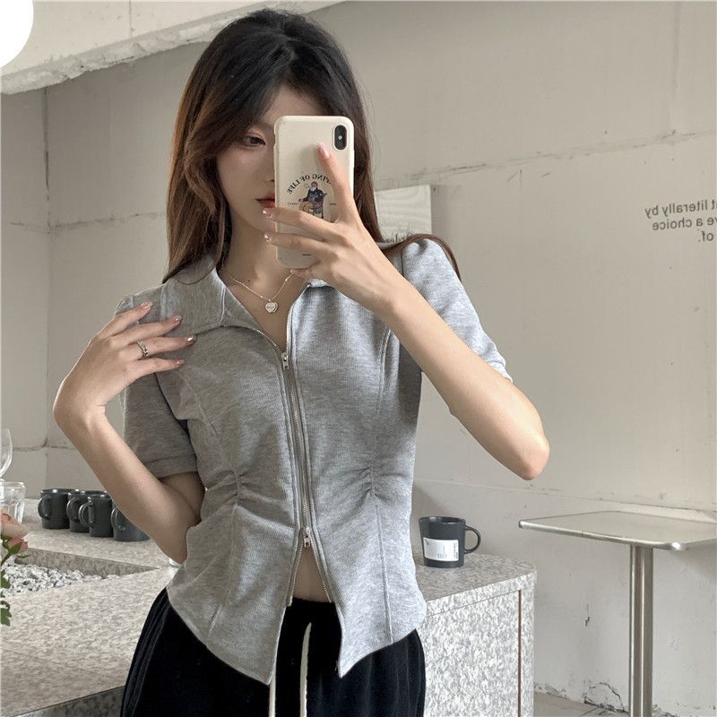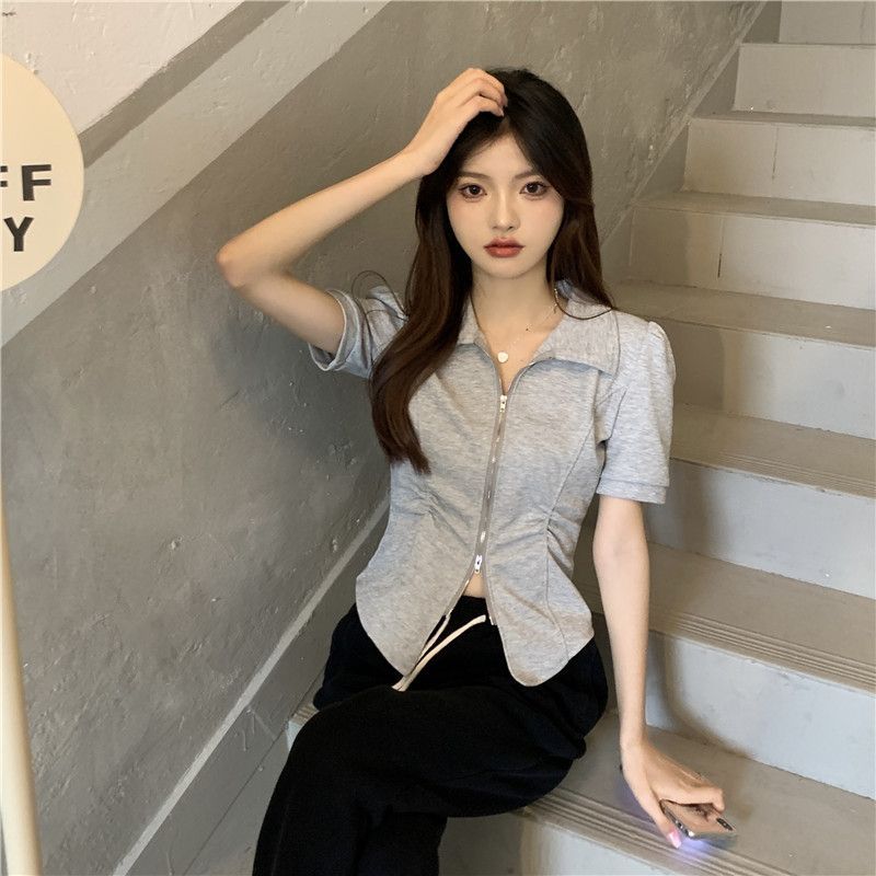 디자인 센스 니쉬 지퍼 폴로 칼라 반팔 티셔츠 여성 2025 년 여름 스파이스 소녀 불규칙한 슬리밍 쇼트 탑스토어 가기
