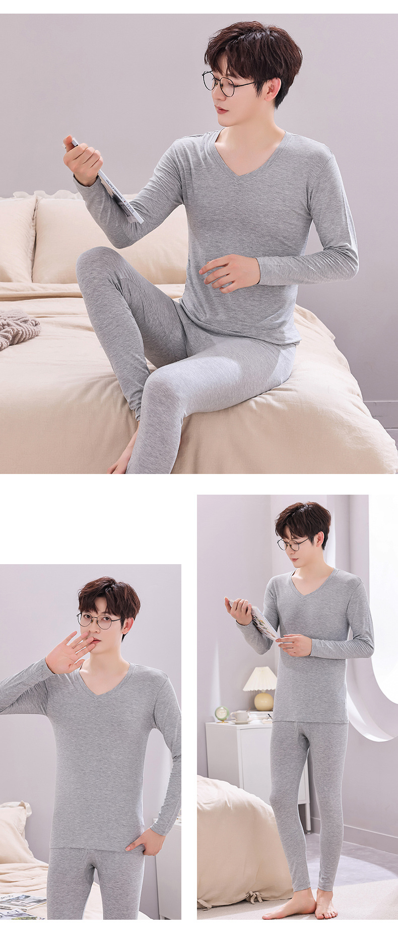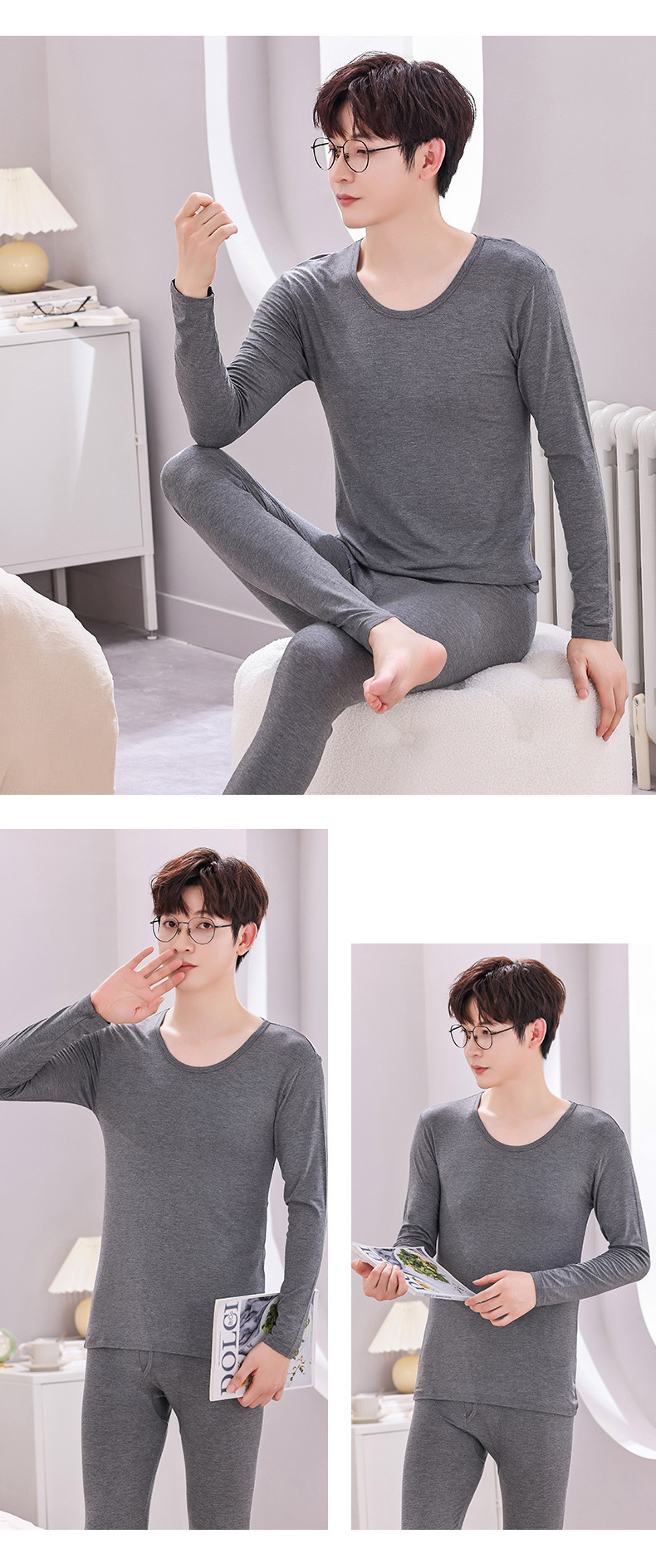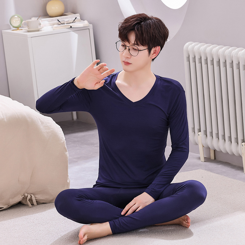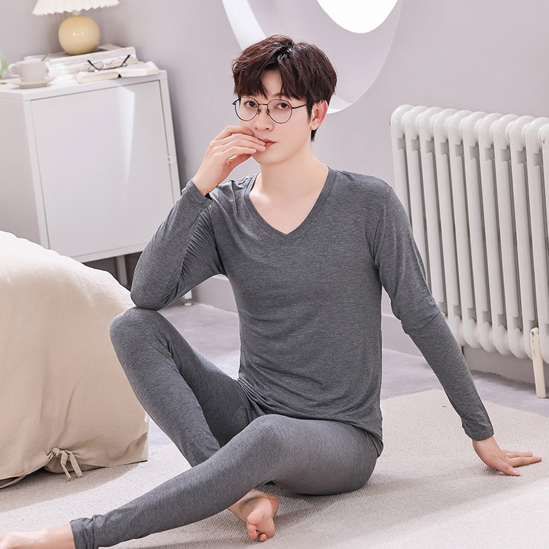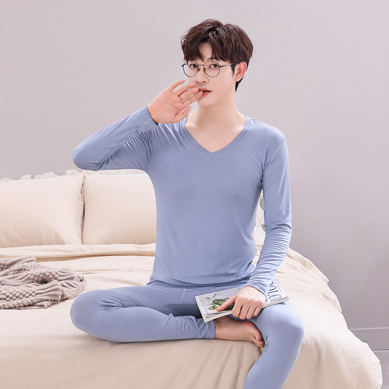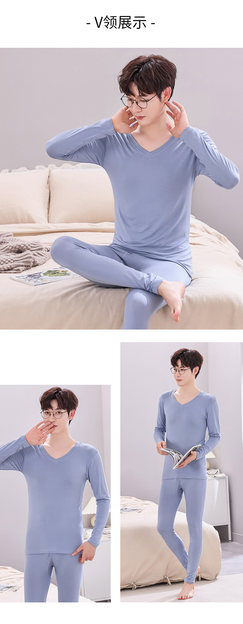 가을 의류 및 바지 남성용 모달 세트 얇은 솔리드 컬러 스트레치 백킹 셔츠 열 속옷 얇은 내부 목 및 바지스토어 가기