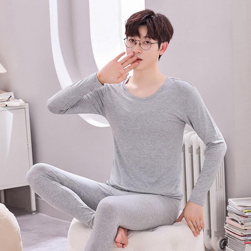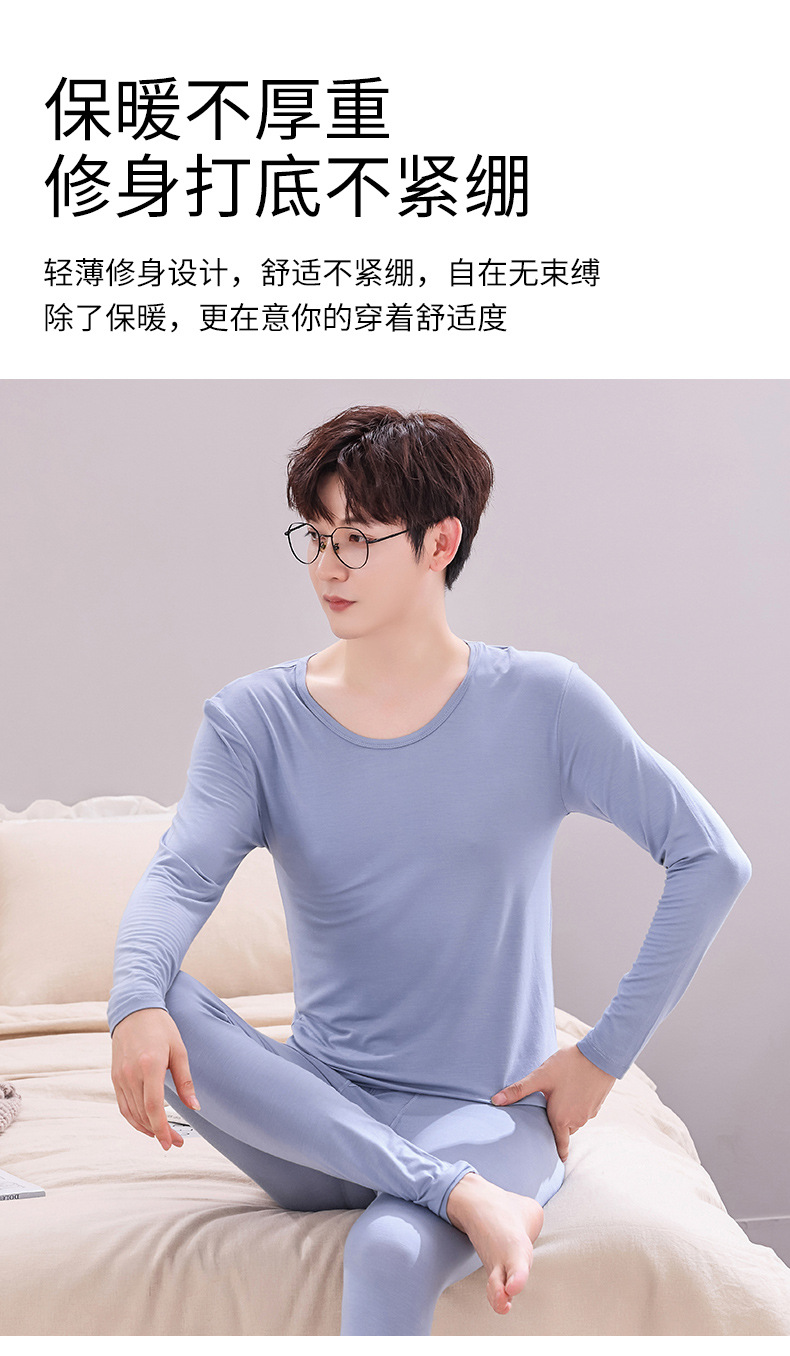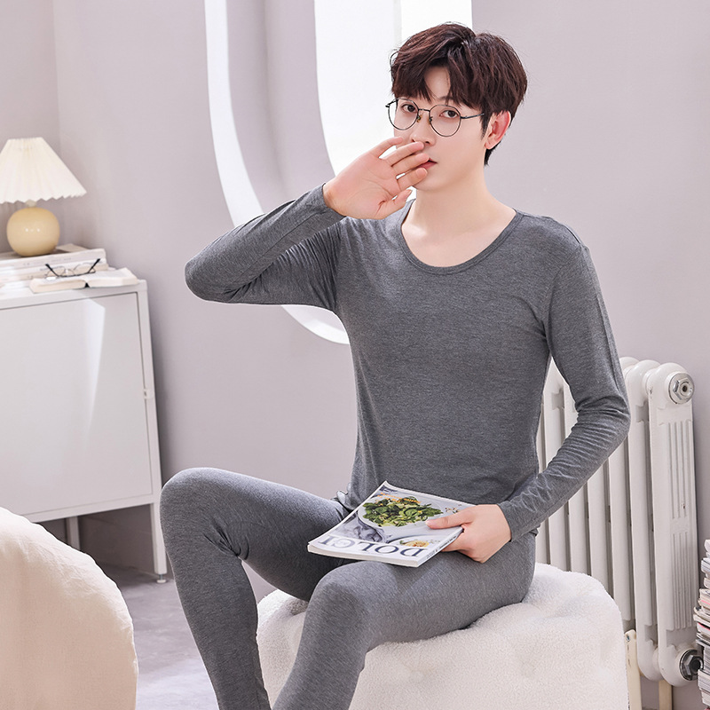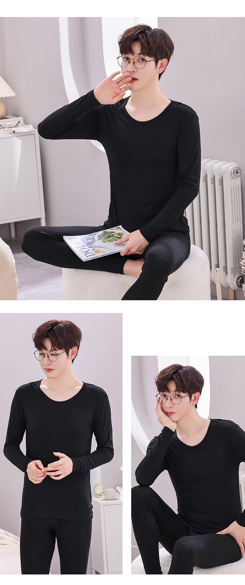 가을 의류 및 바지 남성용 모달 세트 얇은 솔리드 컬러 스트레치 백킹 셔츠 열 속옷 얇은 내부 목 및 바지