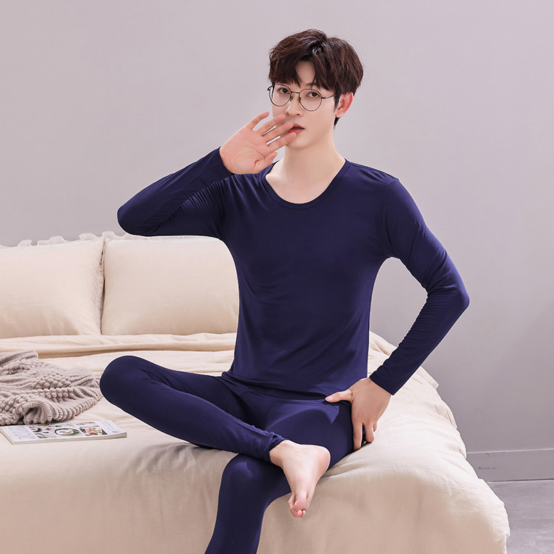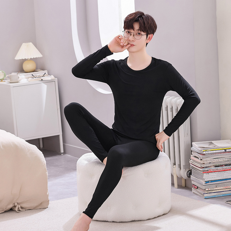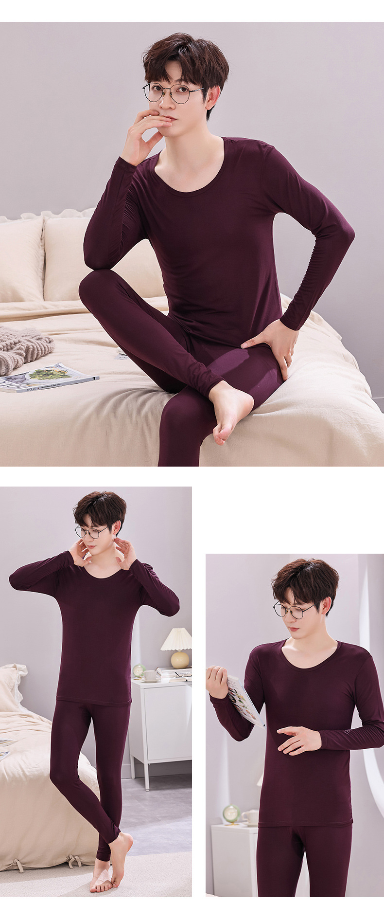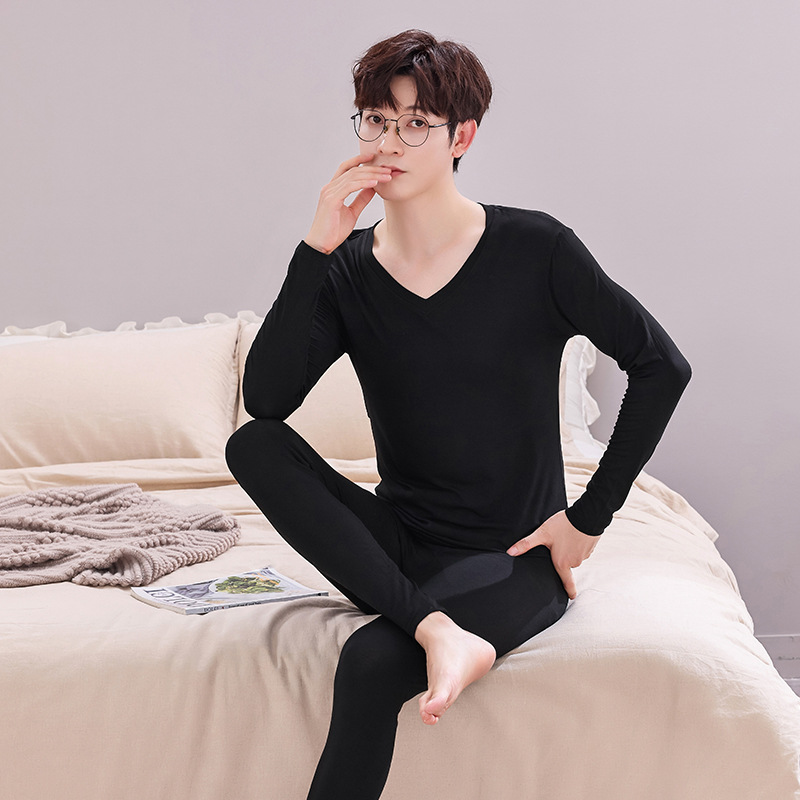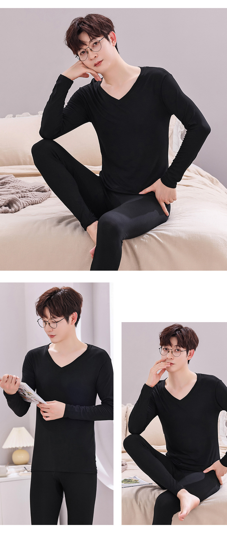 가을 의류 및 바지 남성용 모달 세트 얇은 솔리드 컬러 스트레치 백킹 셔츠 열 속옷 얇은 내부 목 및 바지