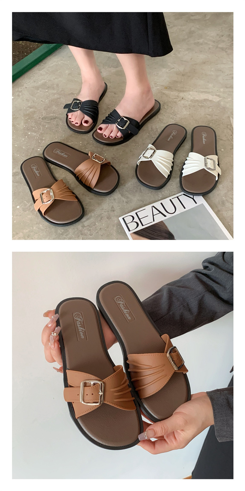 디자인 센스 틈새 슬리퍼 여성 여름 외부 착용 프랑스 휴가 레저 해변 플랫 슬리퍼 새로운 스타일