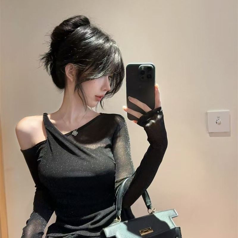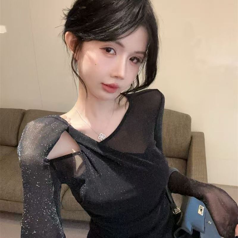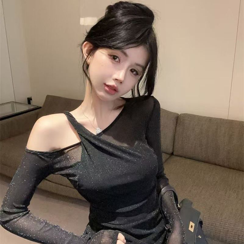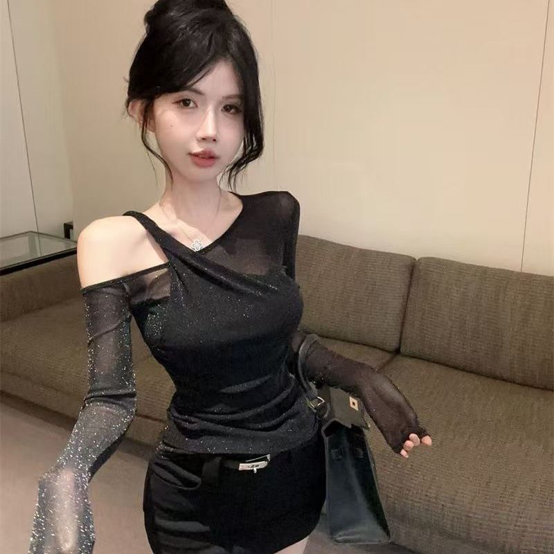 순수한 욕망 스타일 불규칙한 스플 라이스 레이스 오프 숄더 긴팔 쉬폰 셔츠 레이스 여성 슬림 핫 소녀 스타일 탑