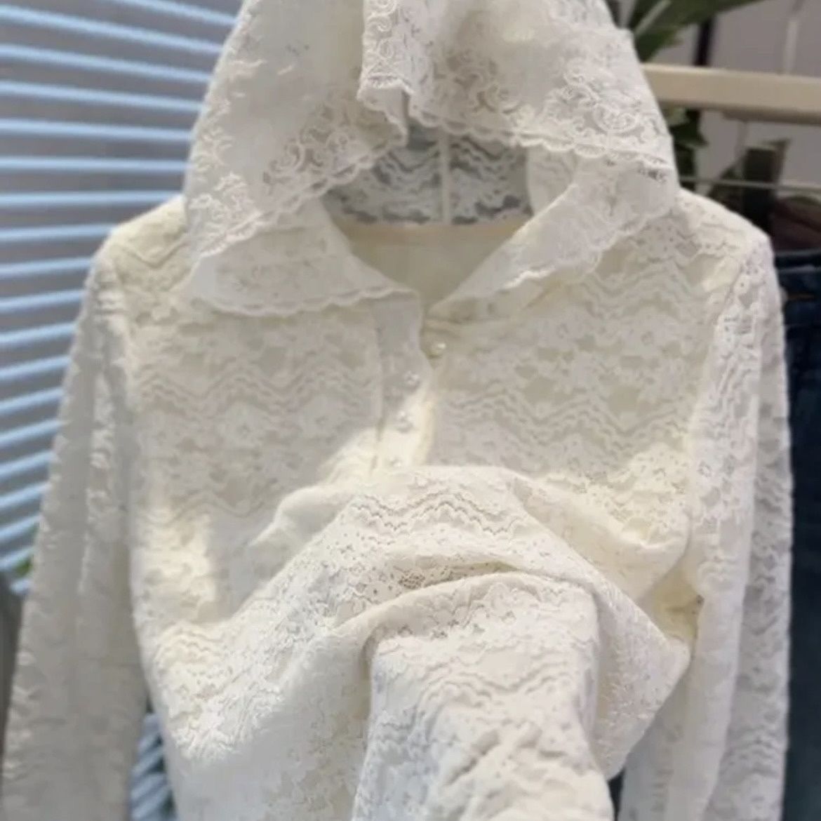 후드 자외선 차단 쉬폰 얇은 투명 중공 크로 셰 뜨개질 v 넥 셔츠 여성 봄, 여름 레이스 셔츠 레이어드 긴팔 탑스토어 가기