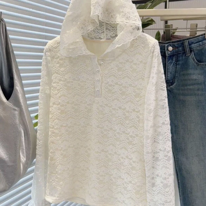 후드 자외선 차단 쉬폰 얇은 투명 중공 크로 셰 뜨개질 v 넥 셔츠 여성 봄, 여름 레이스 셔츠 레이어드 긴팔 탑