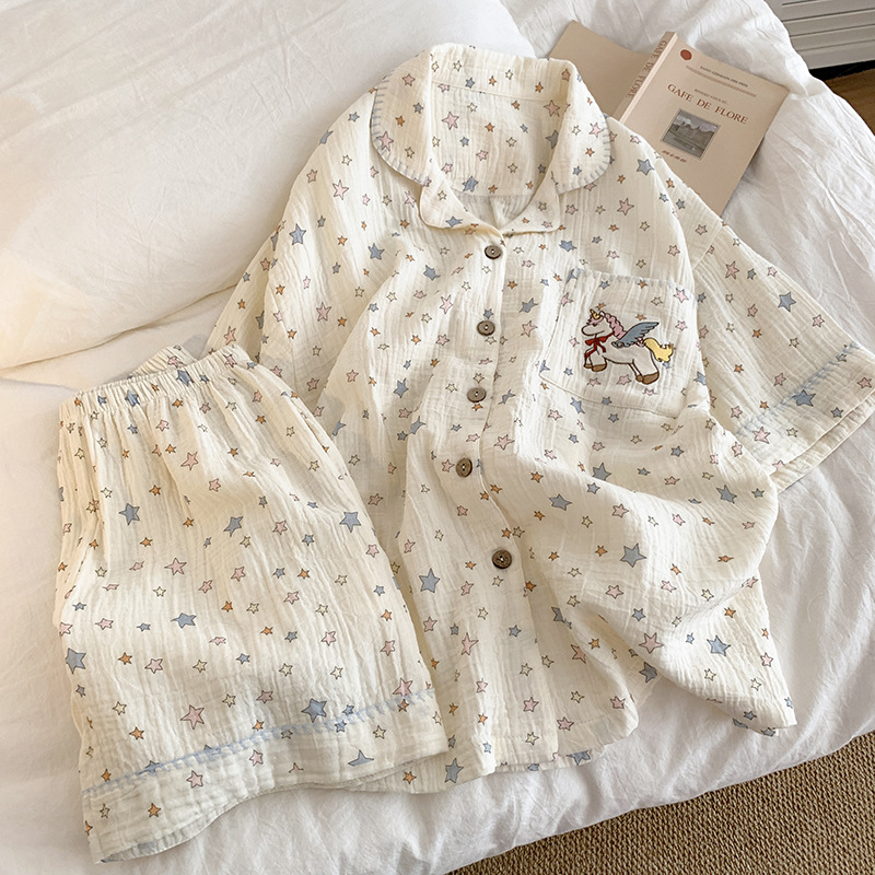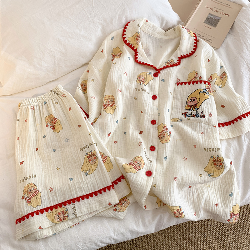 여성을위한 더블 레이어 면화 거즈 잠옷 100% 면 가을 긴팔 바지 여름 귀여운 소녀 홈웨어 세트 도매