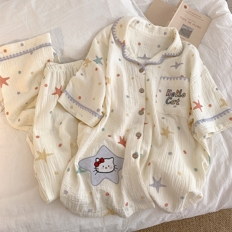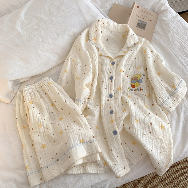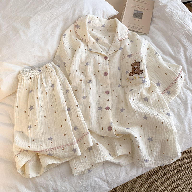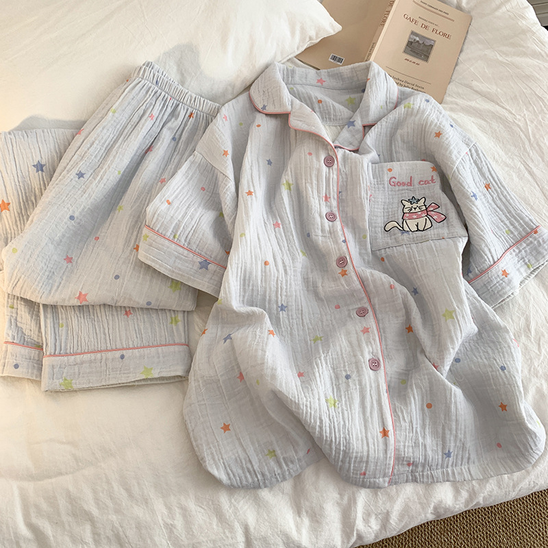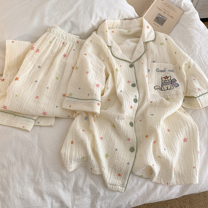 여성을위한 더블 레이어 면화 거즈 잠옷 100% 면 가을 긴팔 바지 여름 귀여운 소녀 홈웨어 세트 도매스토어 가기