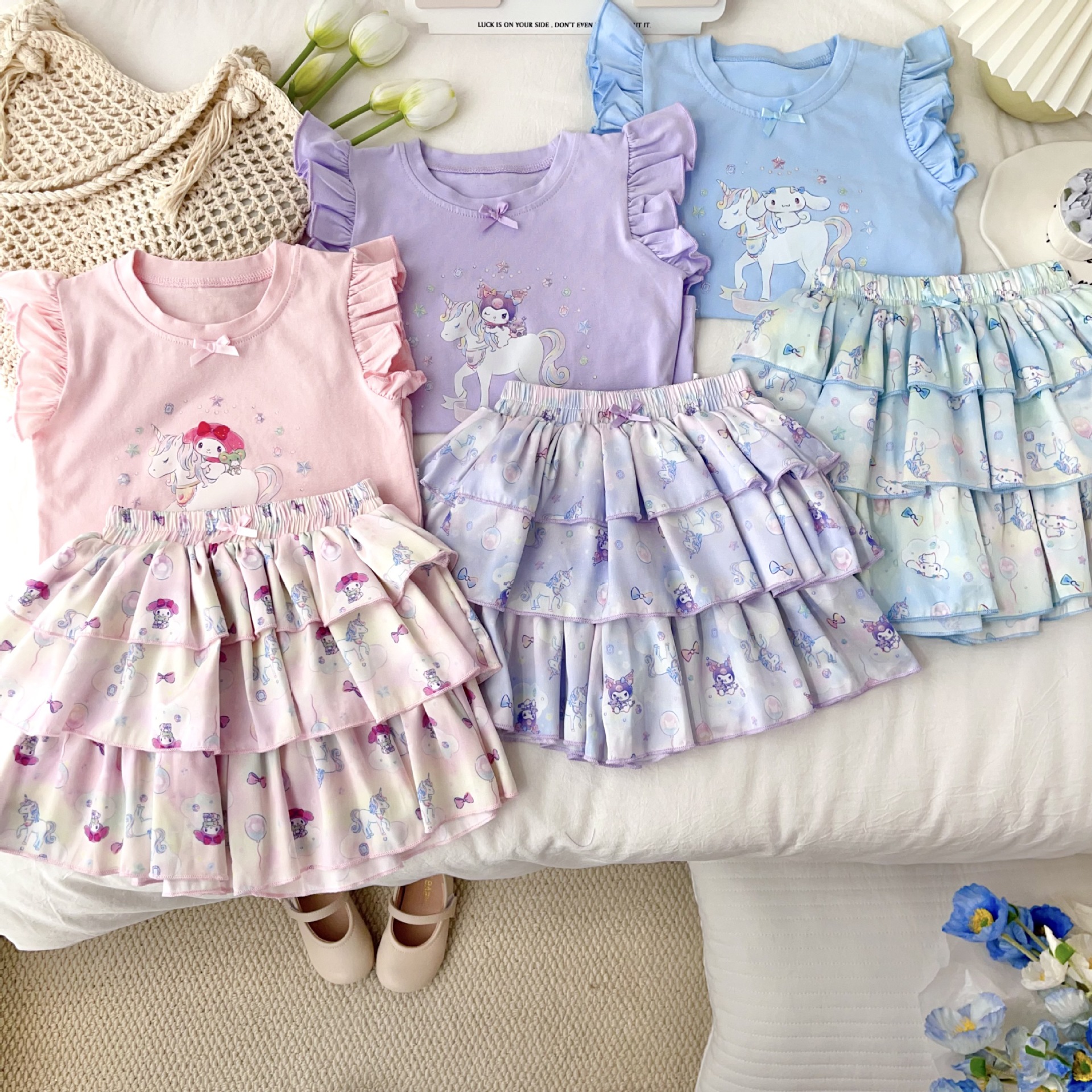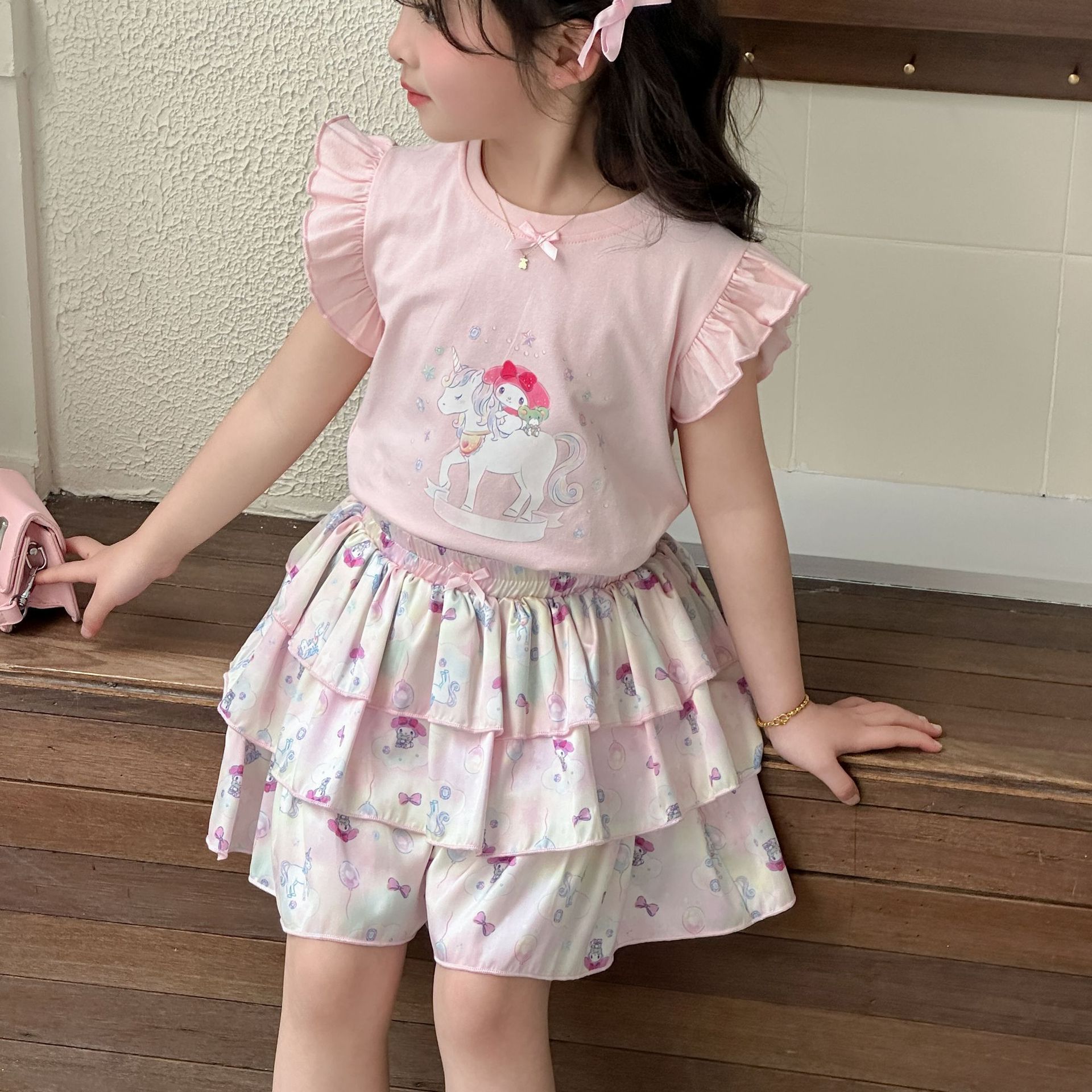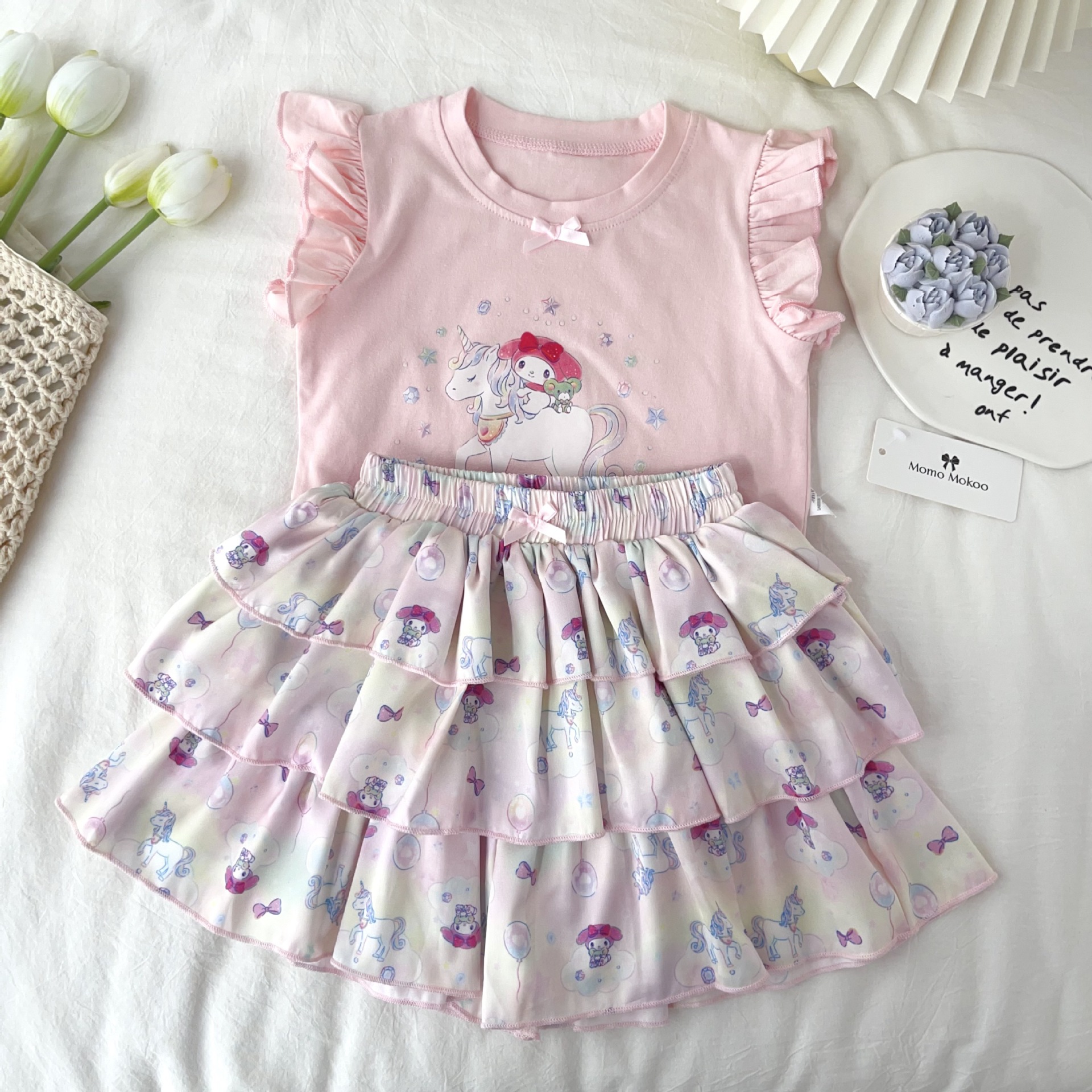 [드림유니콘] 25 개 신형 도착 컬로트 케이크 스커트 귀여운 코튼 라이크라 티셔츠 걸스 세트