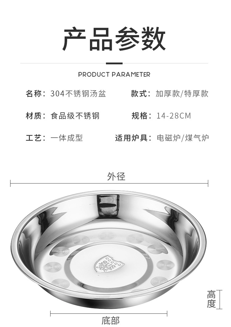 맞춤형 304 스테인레스 스틸 원형 과일 접시, 깊은 평면 접시, 바베큐 접시, 학생 저녁 식사 접시, 가정용 상업용 접시