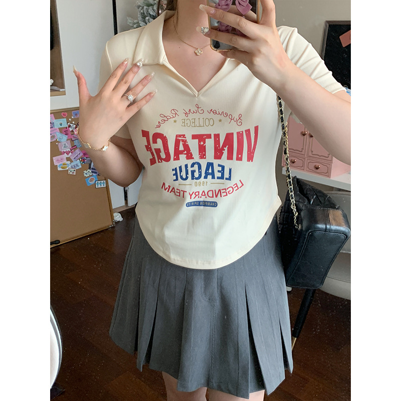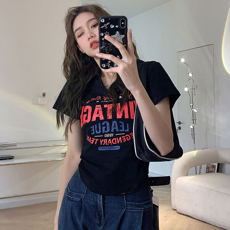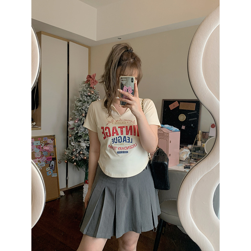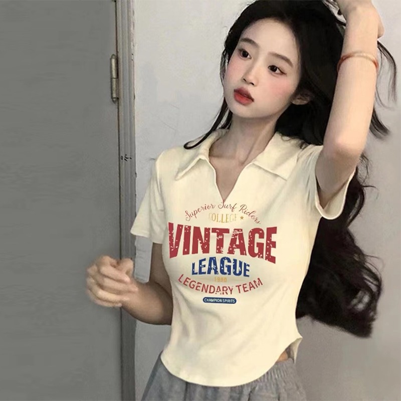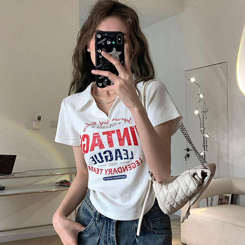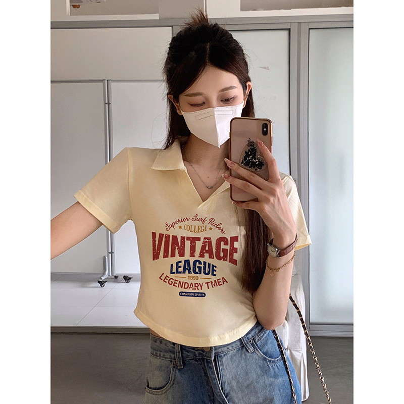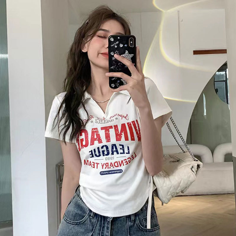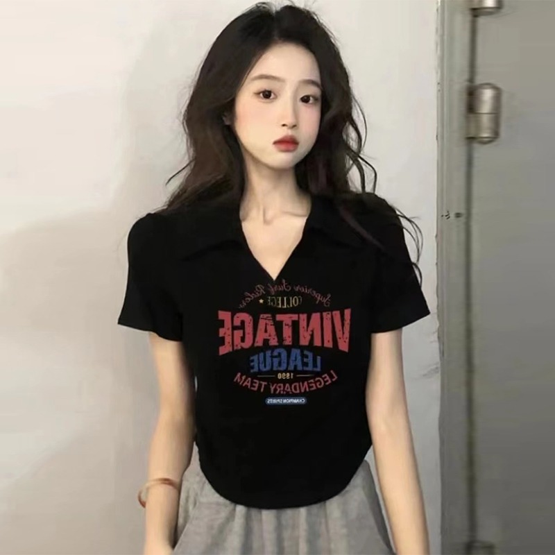 2025 여름 v 넥 오른쪽 어깨 반팔 티셔츠 여성 디자인 틈새 허리 슬림 짧은 폴로 셔츠 핫 소녀 탑스토어 가기