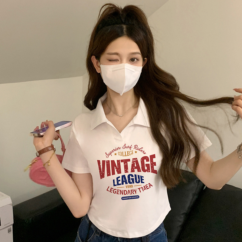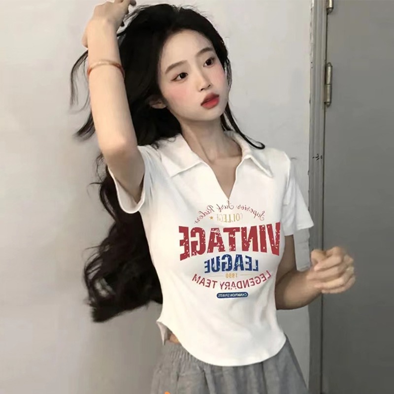 2025 여름 v 넥 오른쪽 어깨 반팔 티셔츠 여성 디자인 틈새 허리 슬림 짧은 폴로 셔츠 핫 소녀 탑