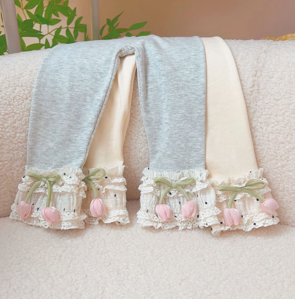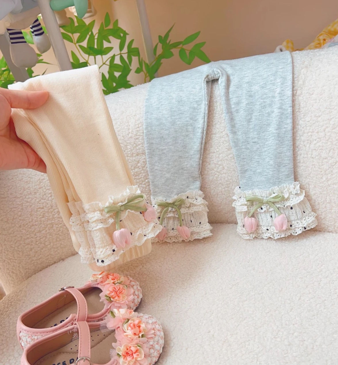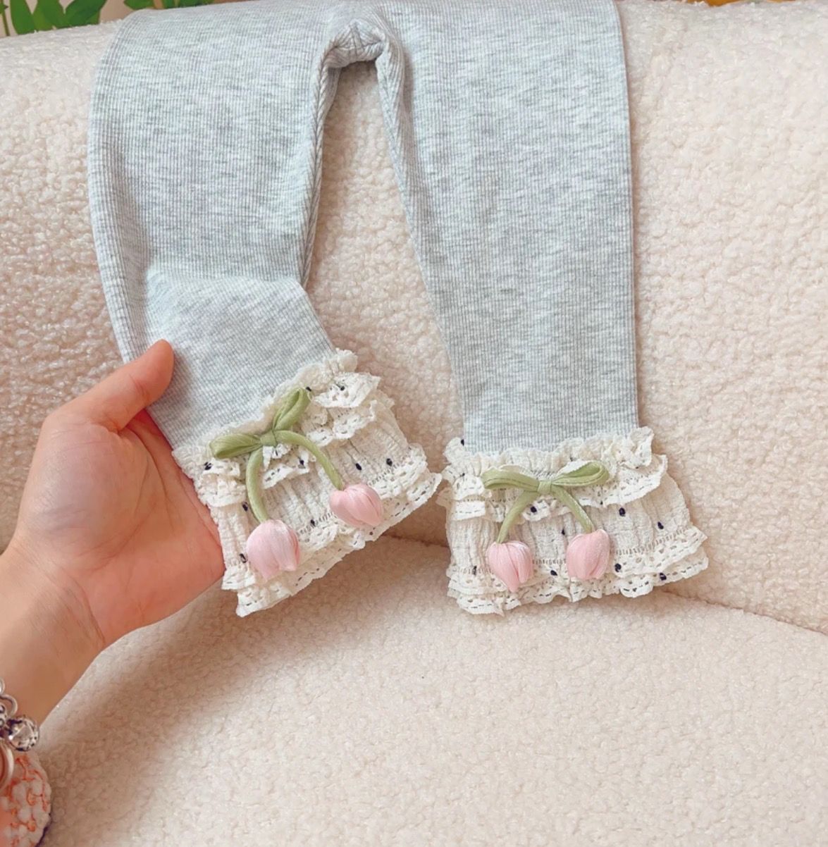 봄과 가을 소녀의 다목적 레깅스 어린이 귀여운 폴카 도트 레이스 튤립 겉옷 긴 바지 0069A076