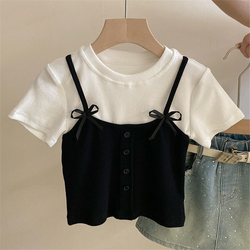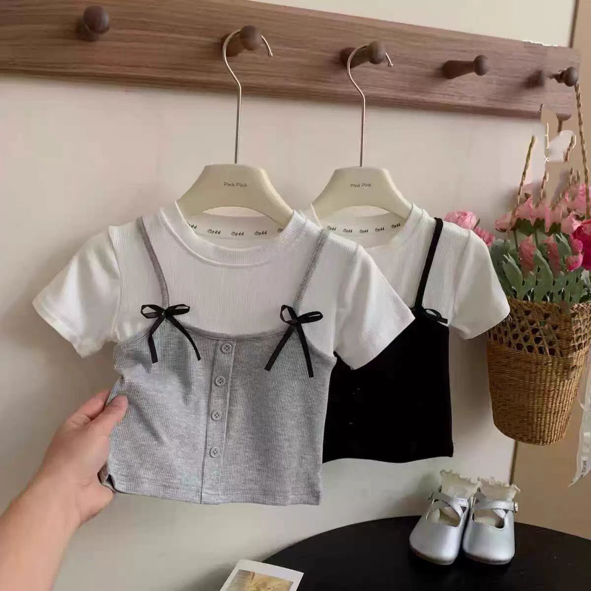 여자 가짜 투피스 반팔 티셔츠 2025 한국 스타일 여름 어린이 유행 기질 보우 슬림 스트레치 탑