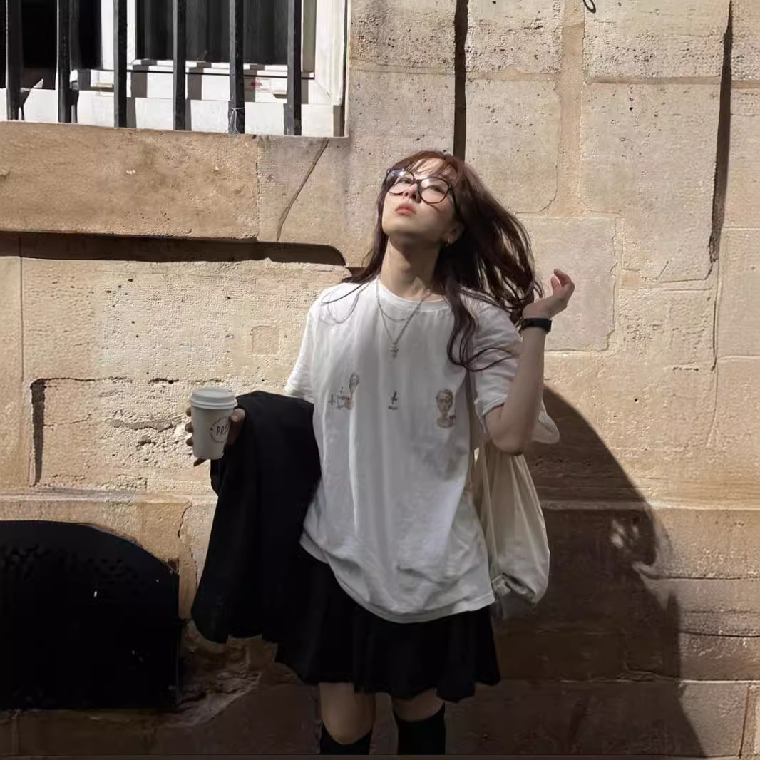 이제 H2025 한국 동대문 여름 새로운 fle * ta 복고풍 캐주얼 초상화 인쇄 짧은 소매 티셔츠 여성스토어 가기