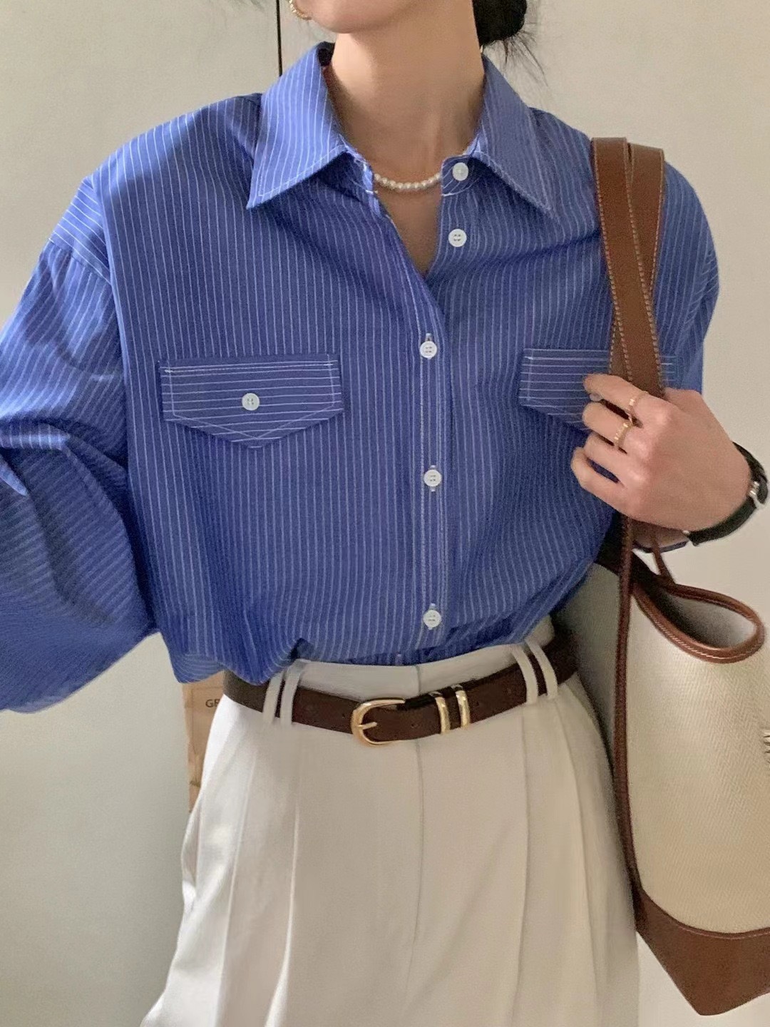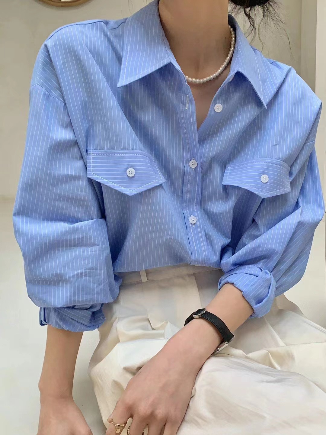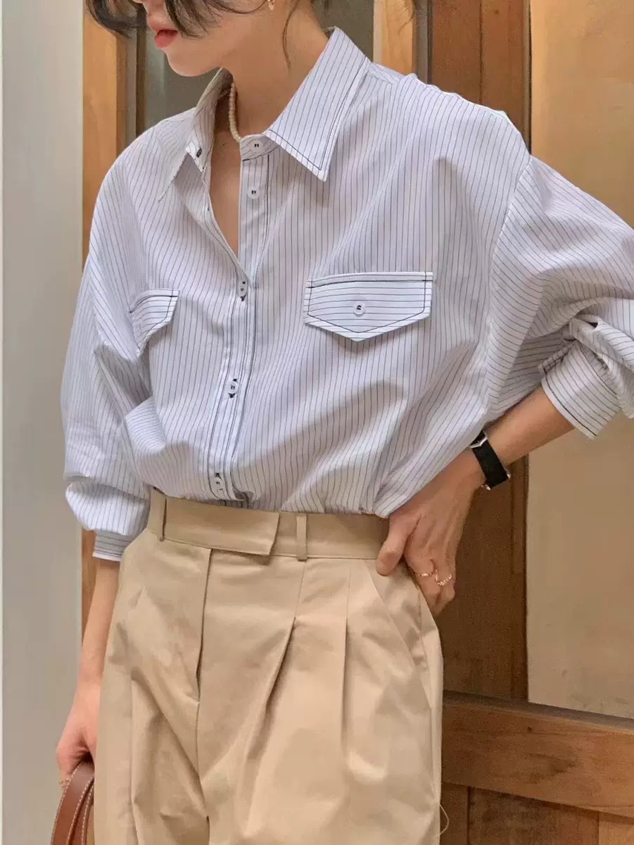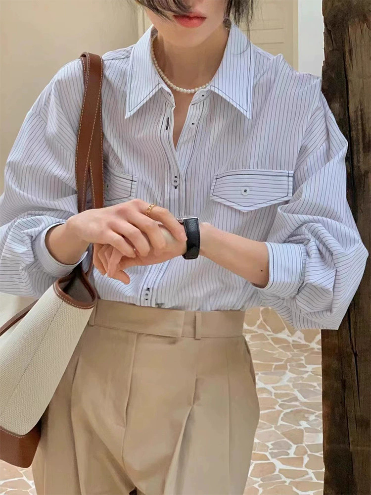 한국 세련된 이른 봄 기질 라펠 다용도 싱글 브레스트 포켓 루즈한 긴팔 셔츠 여성용 스트라이프 셔츠스토어 가기