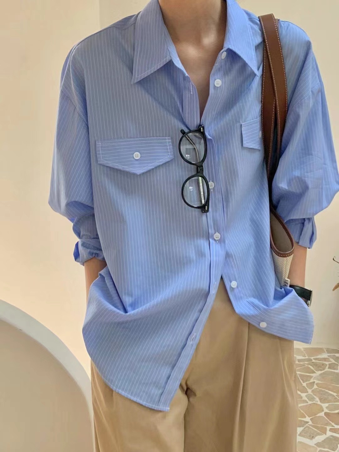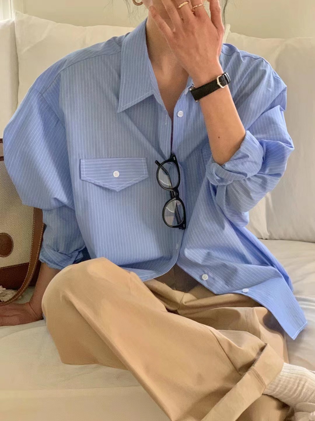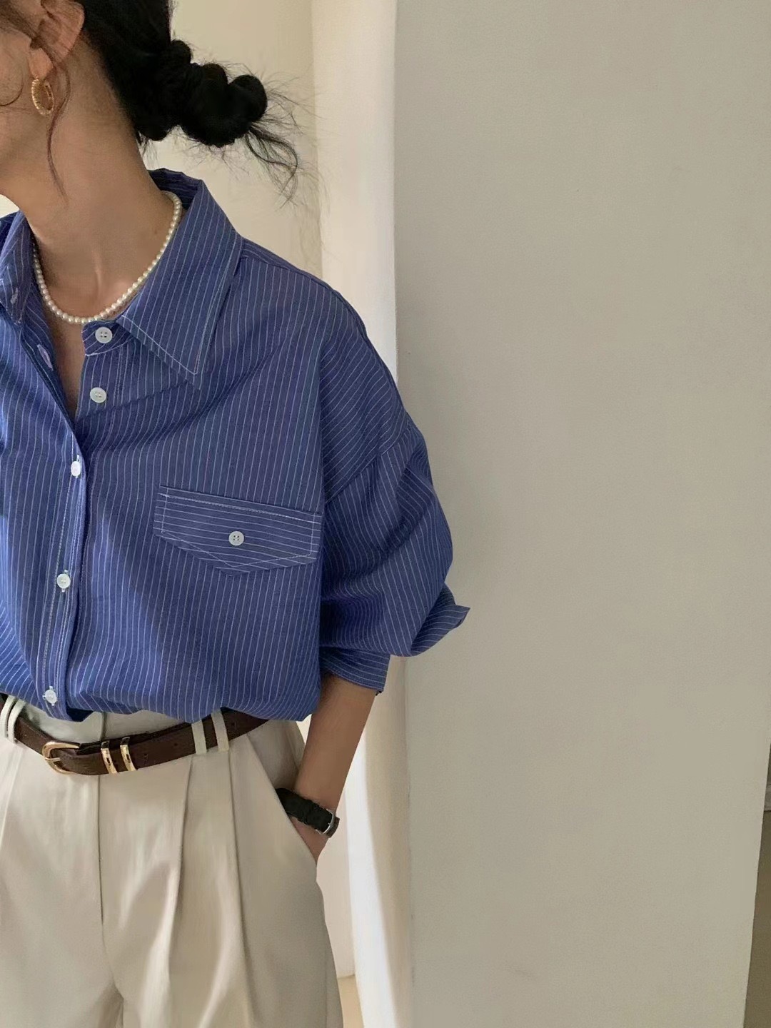 한국 세련된 이른 봄 기질 라펠 다용도 싱글 브레스트 포켓 루즈한 긴팔 셔츠 여성용 스트라이프 셔츠스토어 가기