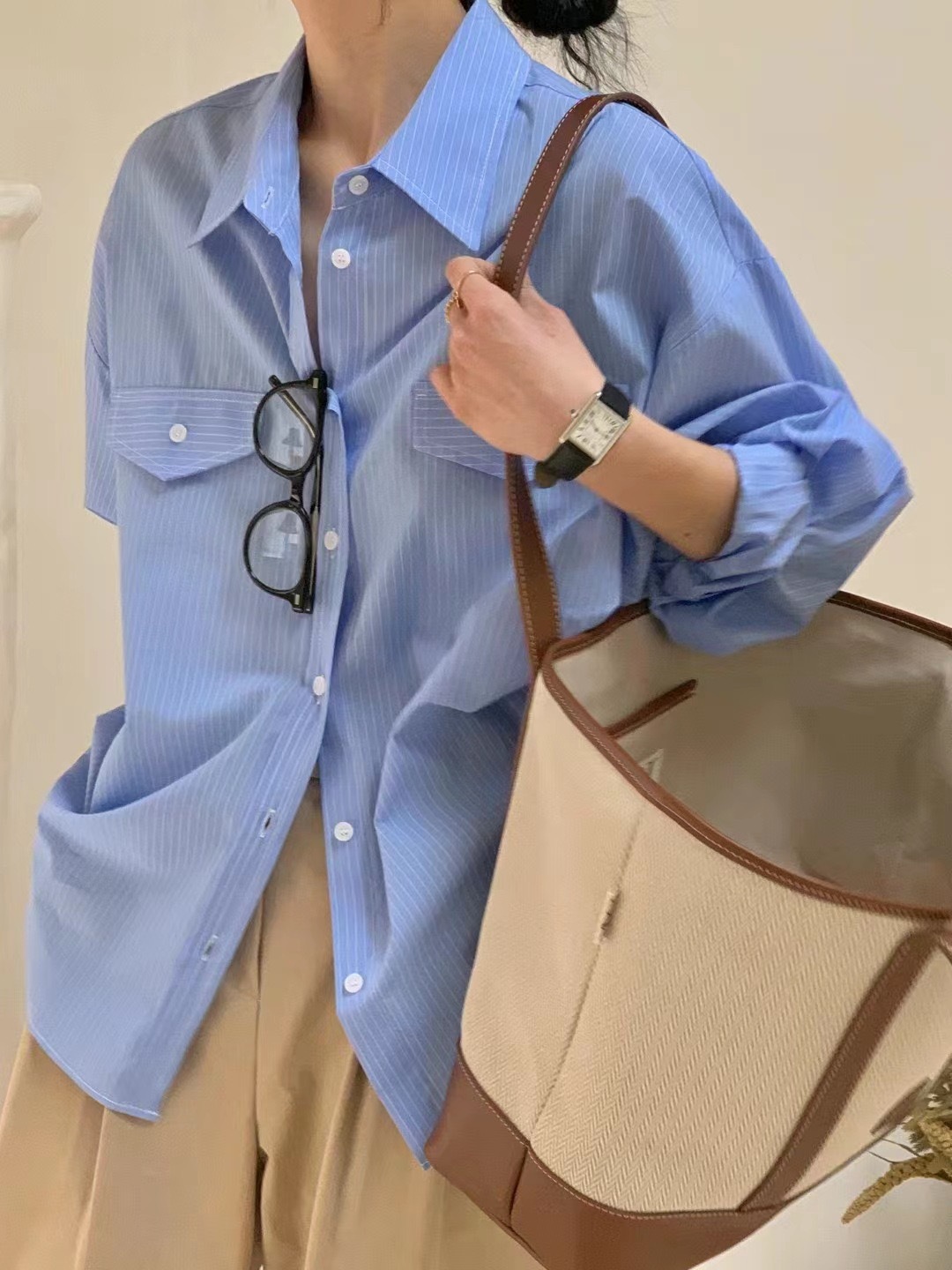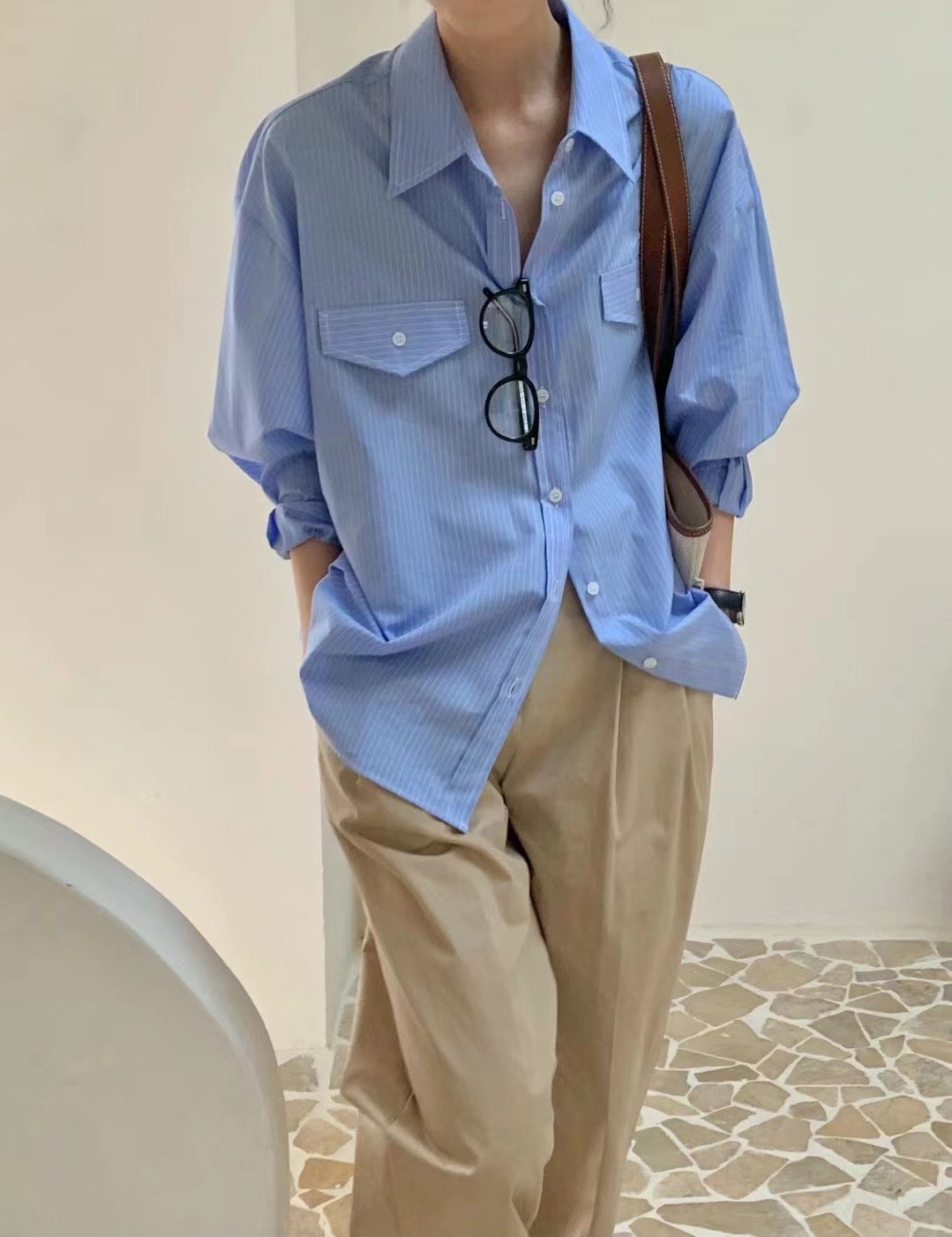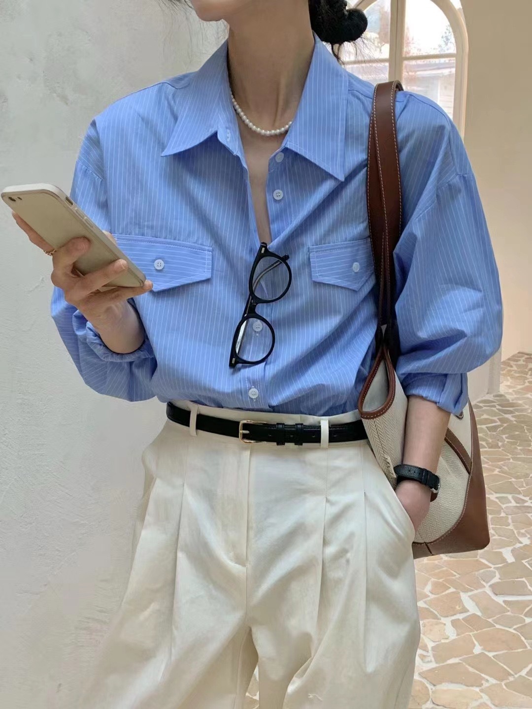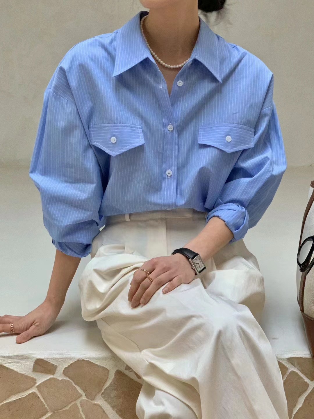 한국 세련된 이른 봄 기질 라펠 다용도 싱글 브레스트 포켓 루즈한 긴팔 셔츠 여성용 스트라이프 셔츠스토어 가기