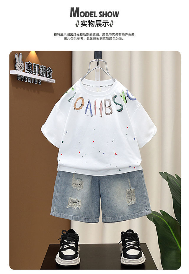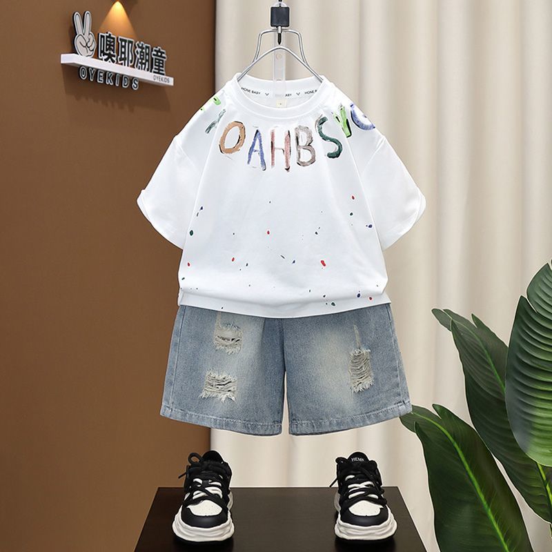소년 여름 세트 유행 아기 반팔 옷 2024 새로운 스타일 어린이 캐주얼 여름 얇은 티셔츠