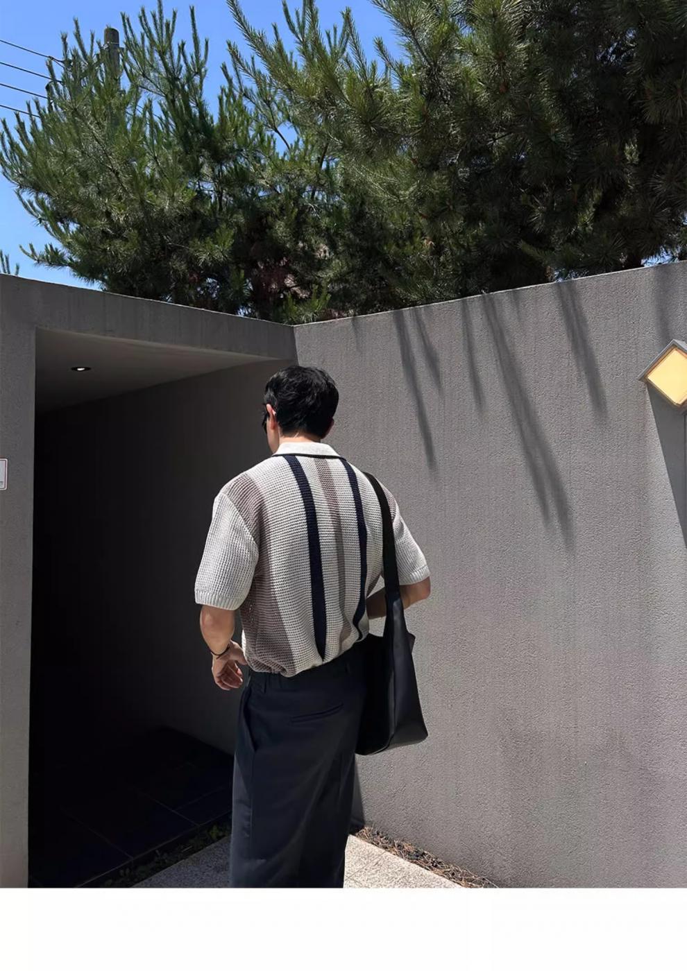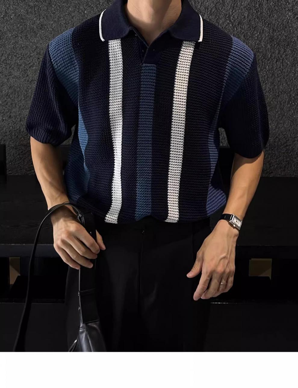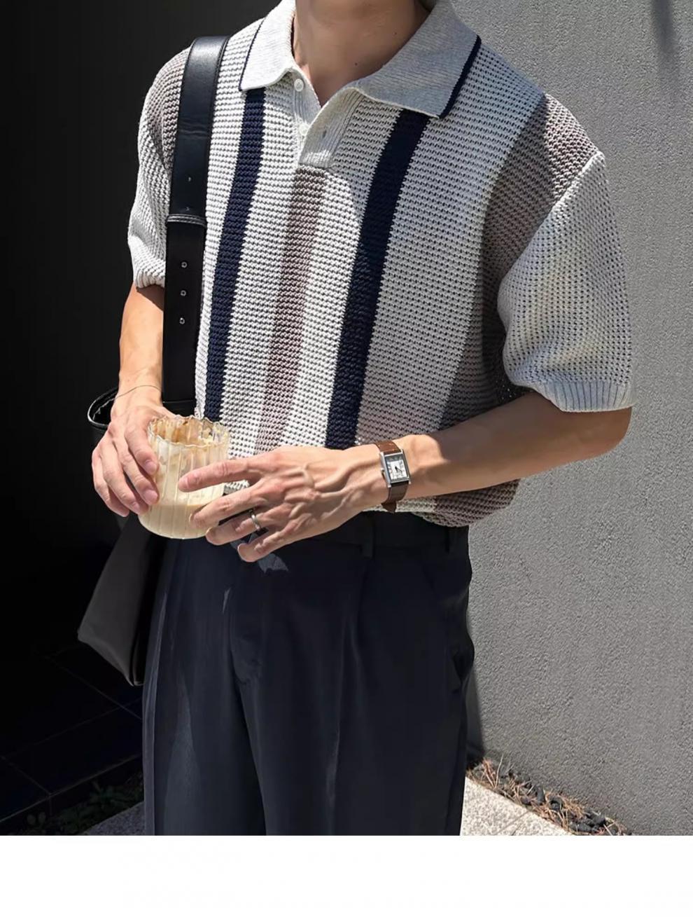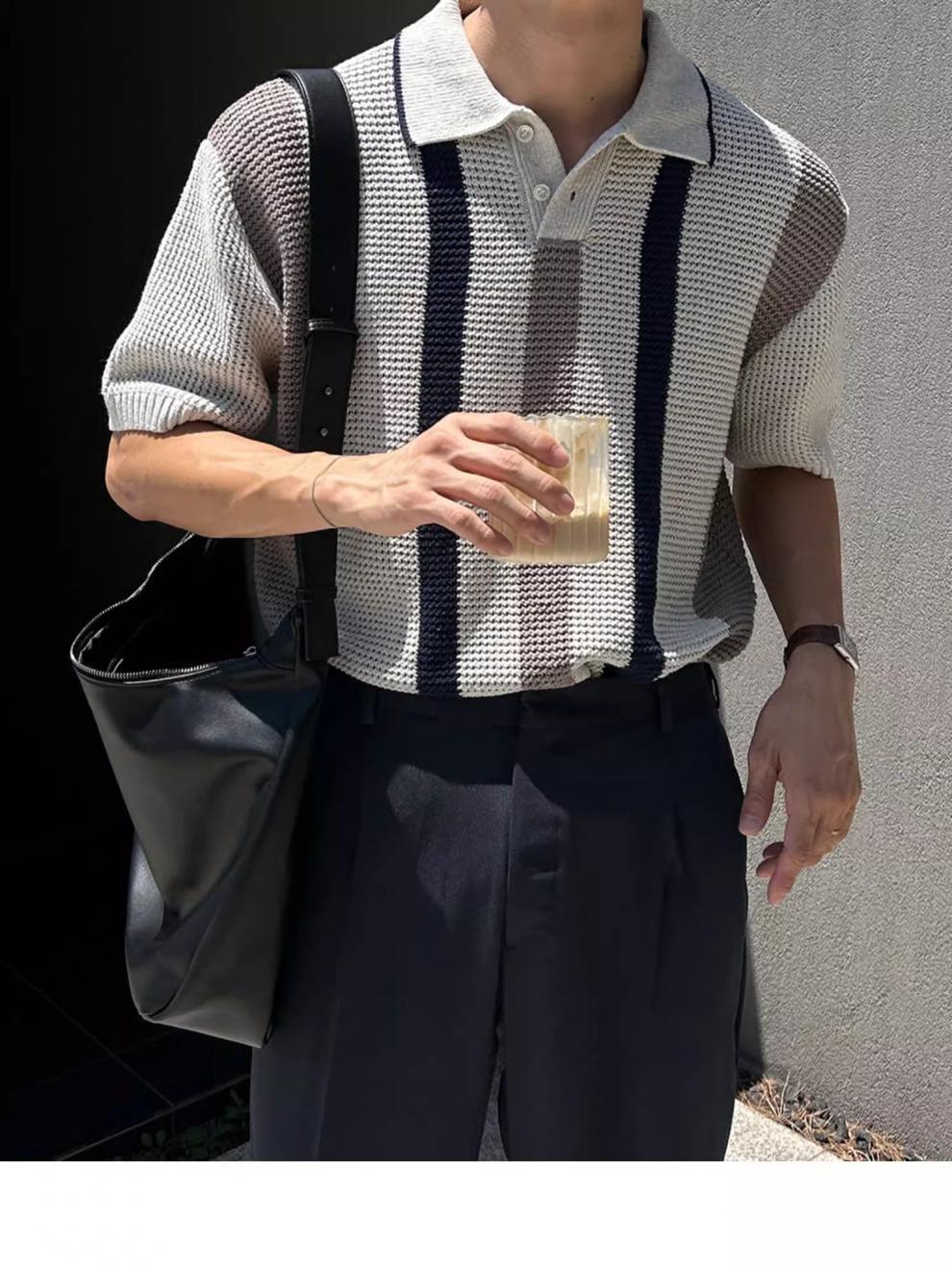 미국의 터프 가이 빈 셔츠 근육 남자 스트라이프 느슨한 반팔 카디건 아이스 쿨 실크 니트 셔츠 재킷스토어 가기