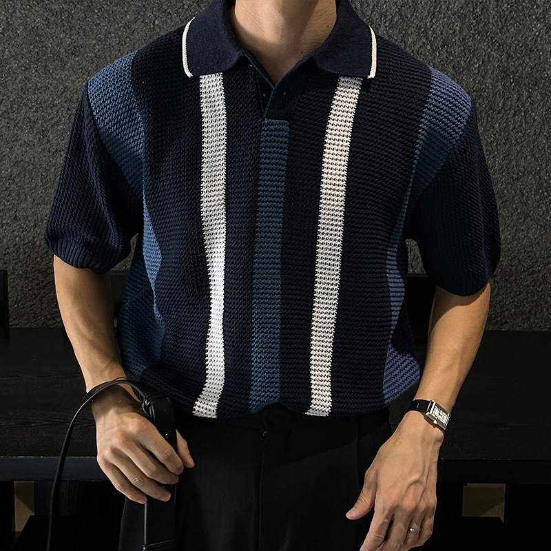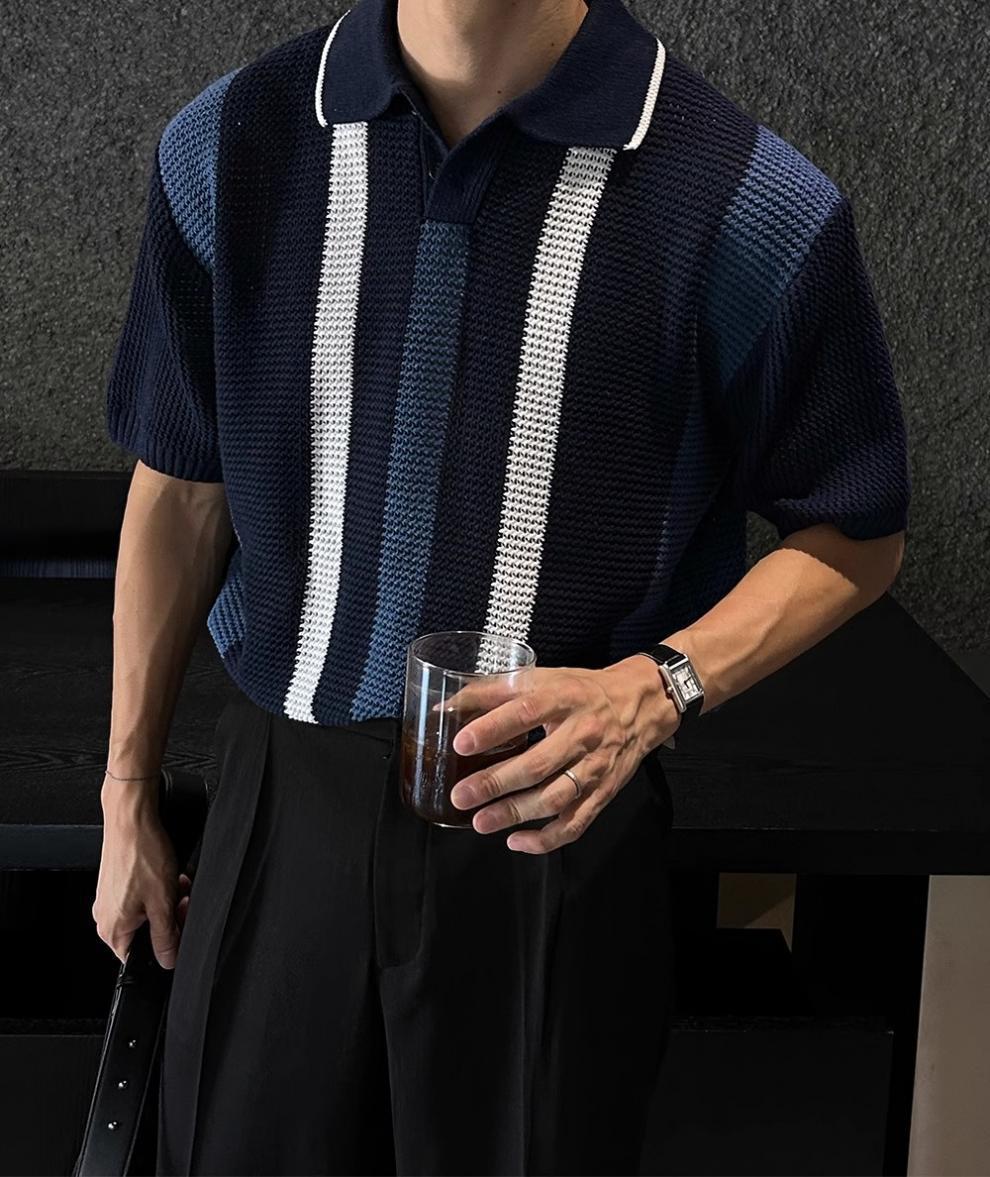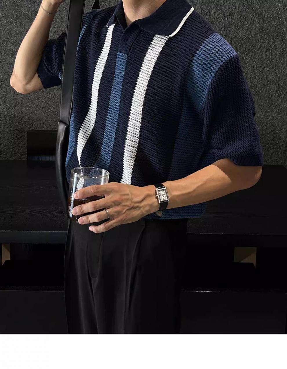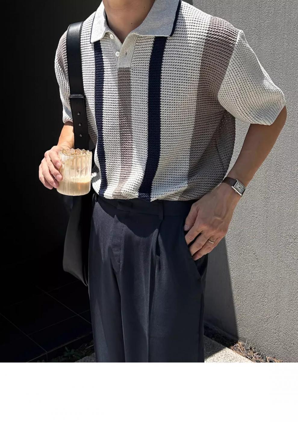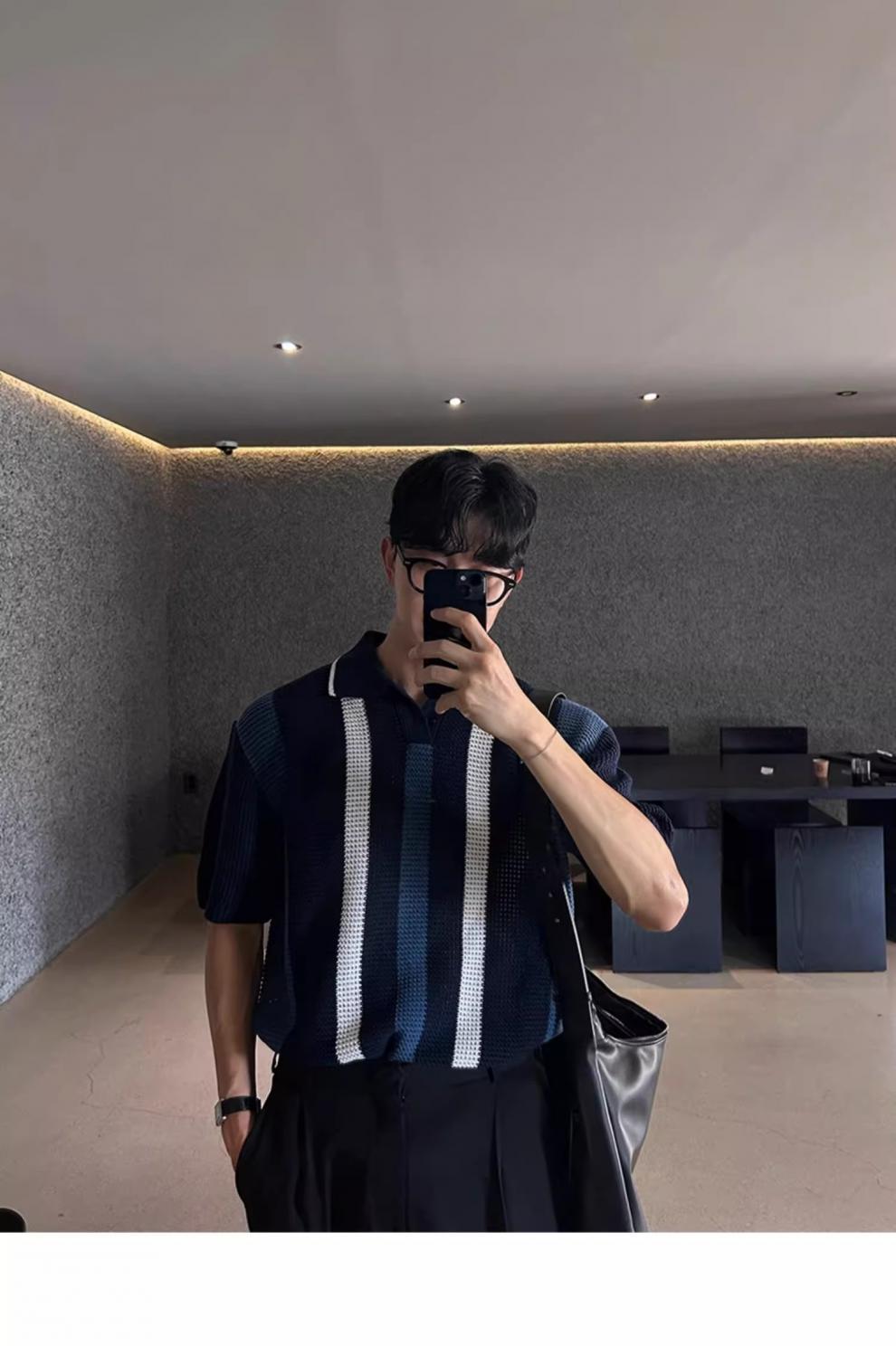 미국의 터프 가이 빈 셔츠 근육 남자 스트라이프 느슨한 반팔 카디건 아이스 쿨 실크 니트 셔츠 재킷스토어 가기