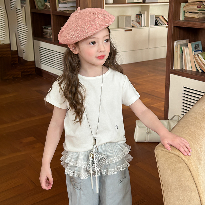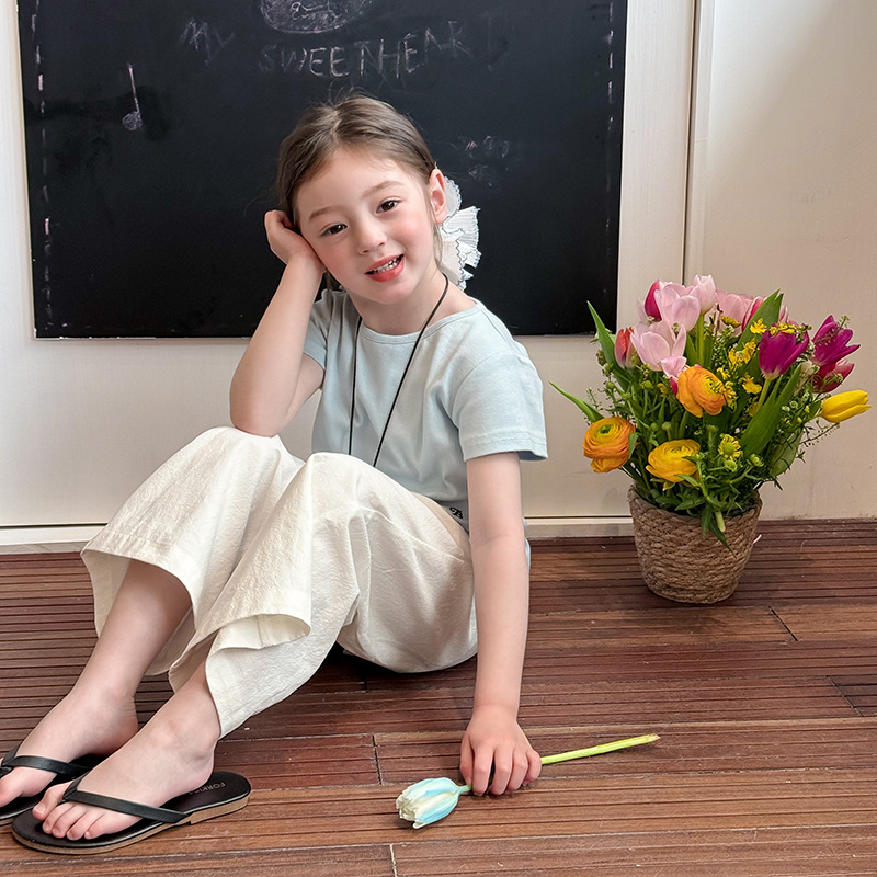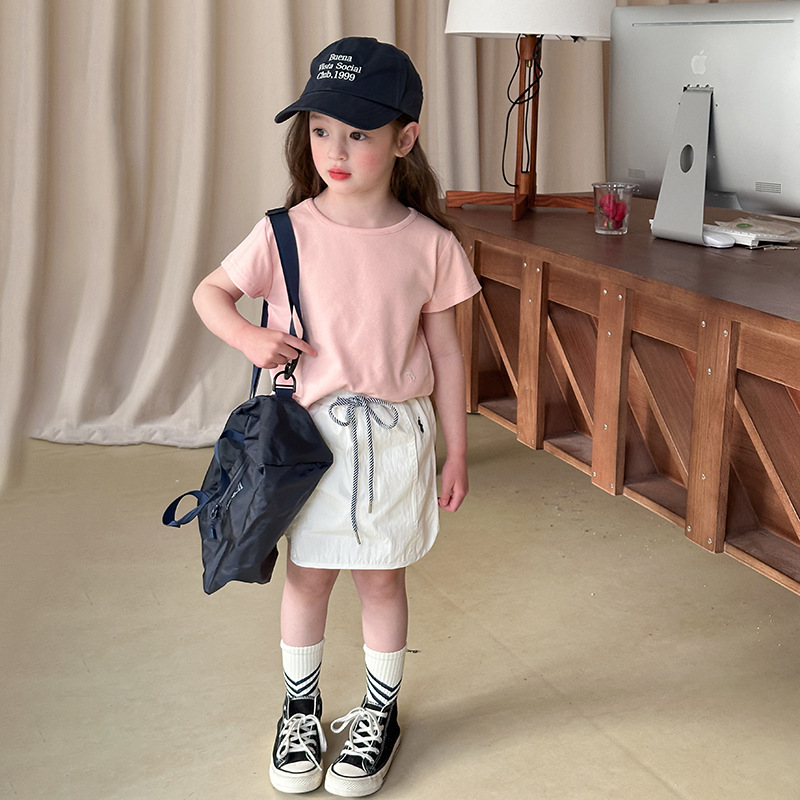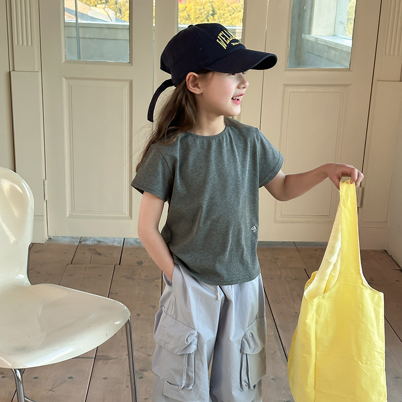 아이모베이베이샤 신상품 여아 한국 스타일 반팔 티셔츠 심플 자수 레터링 라운드넥 반팔 티셔츠