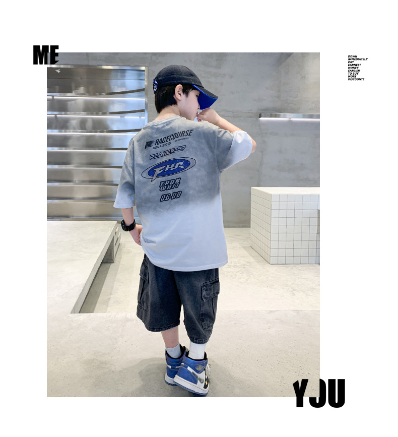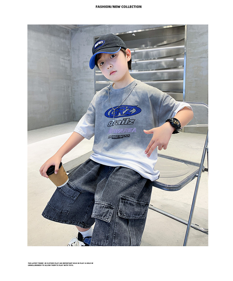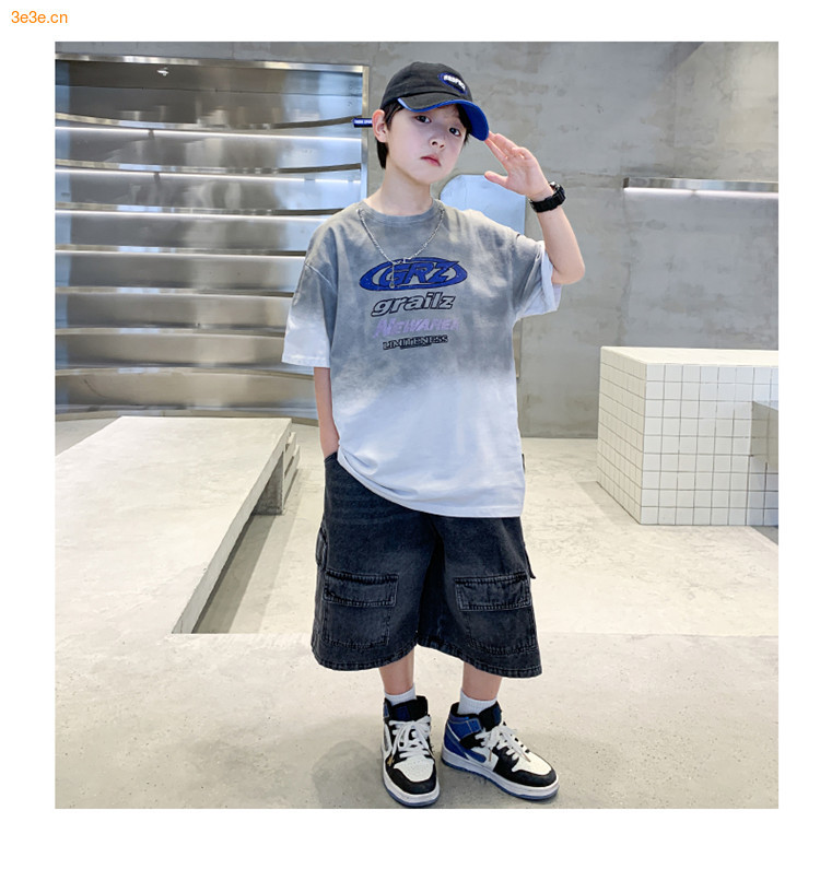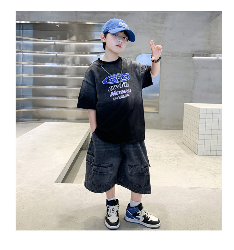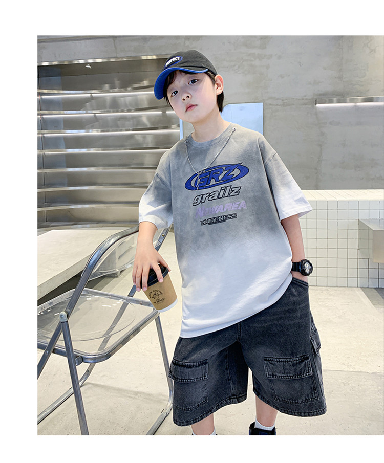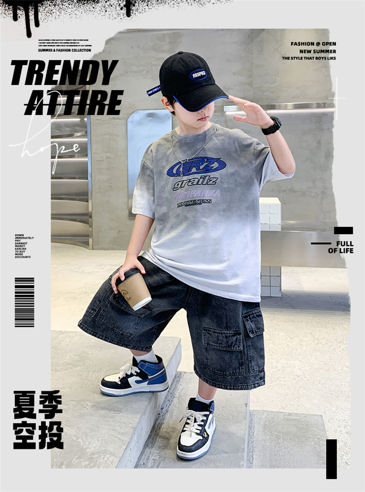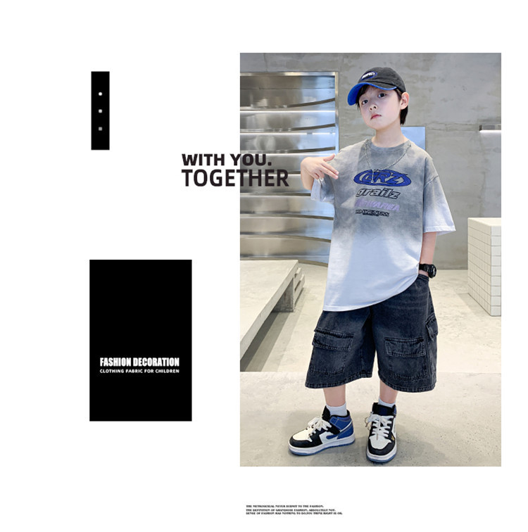 대외 무역 트렌디하고 멋진 아동복 소년 여름 반팔 양복 패셔너블 데님 카고 반바지 타이 염색 티셔츠 투피스 세트스토어 가기
