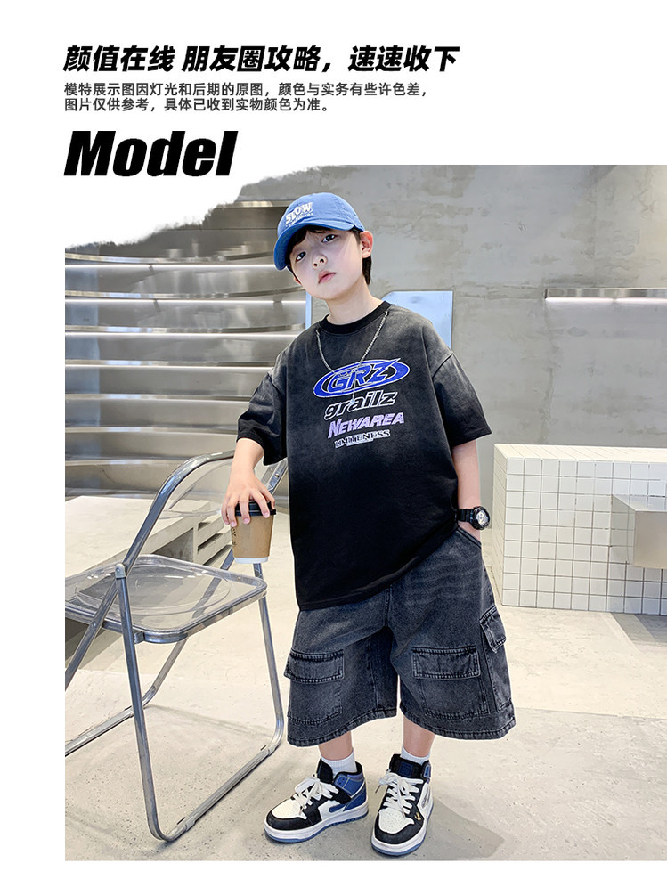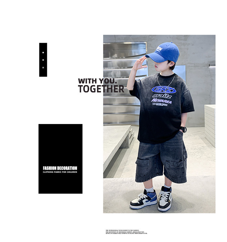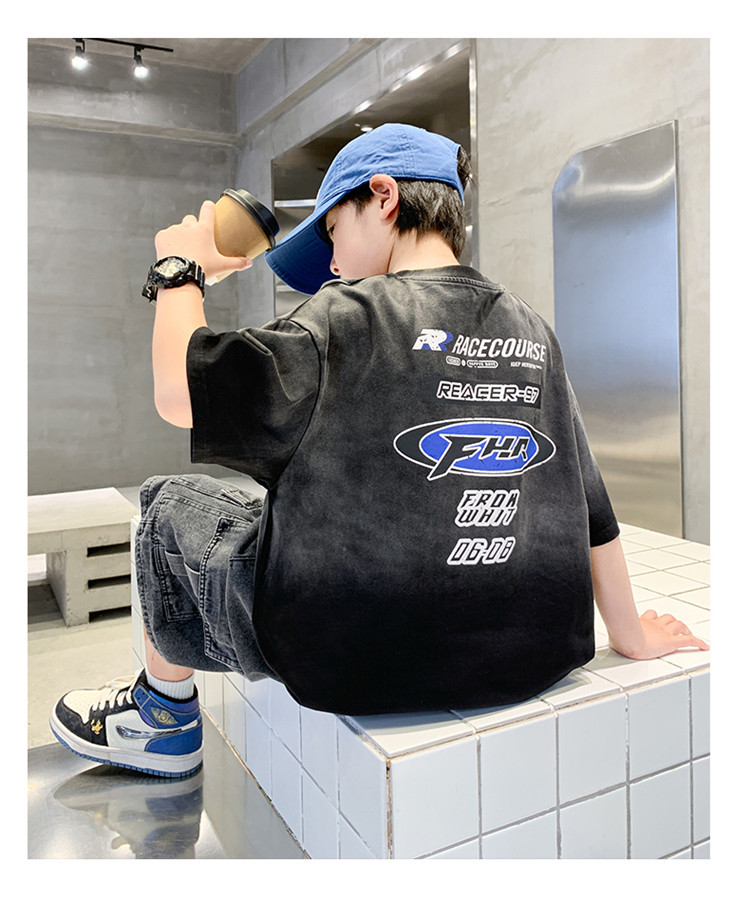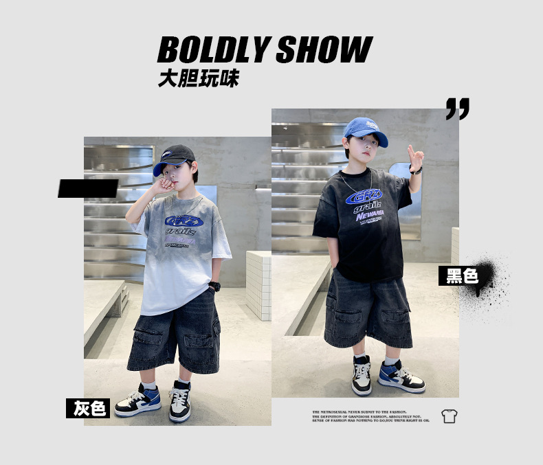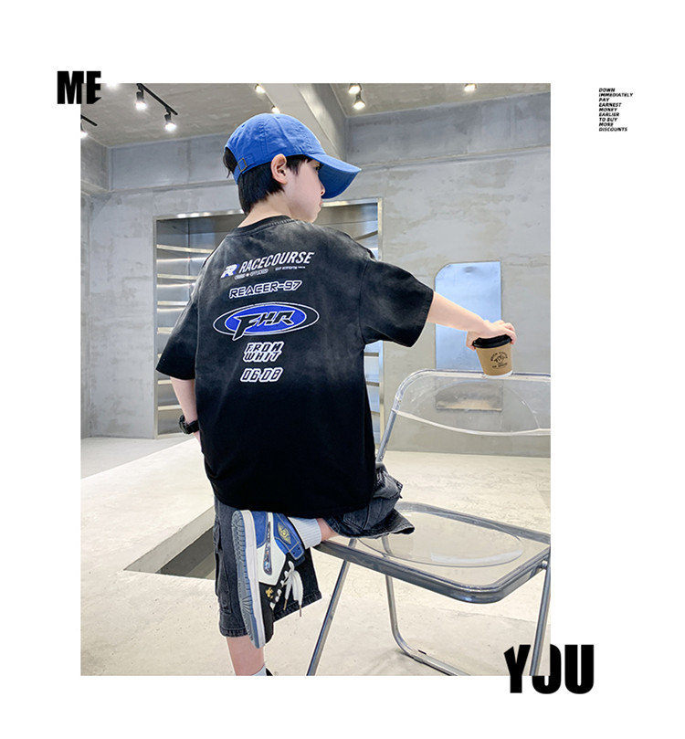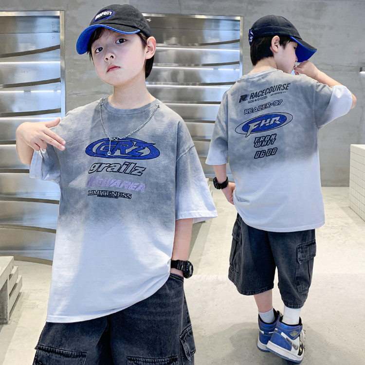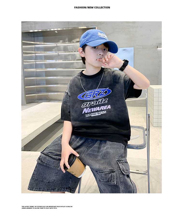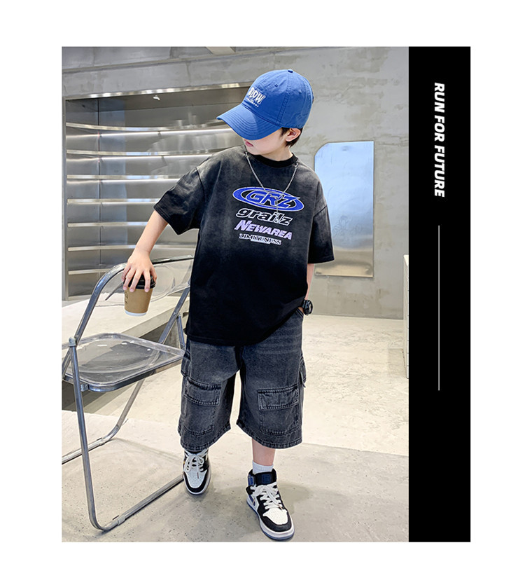 대외 무역 트렌디하고 멋진 아동복 소년 여름 반팔 양복 패셔너블 데님 카고 반바지 타이 염색 티셔츠 투피스 세트스토어 가기