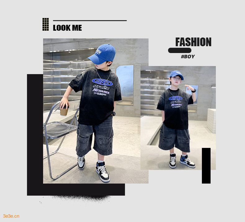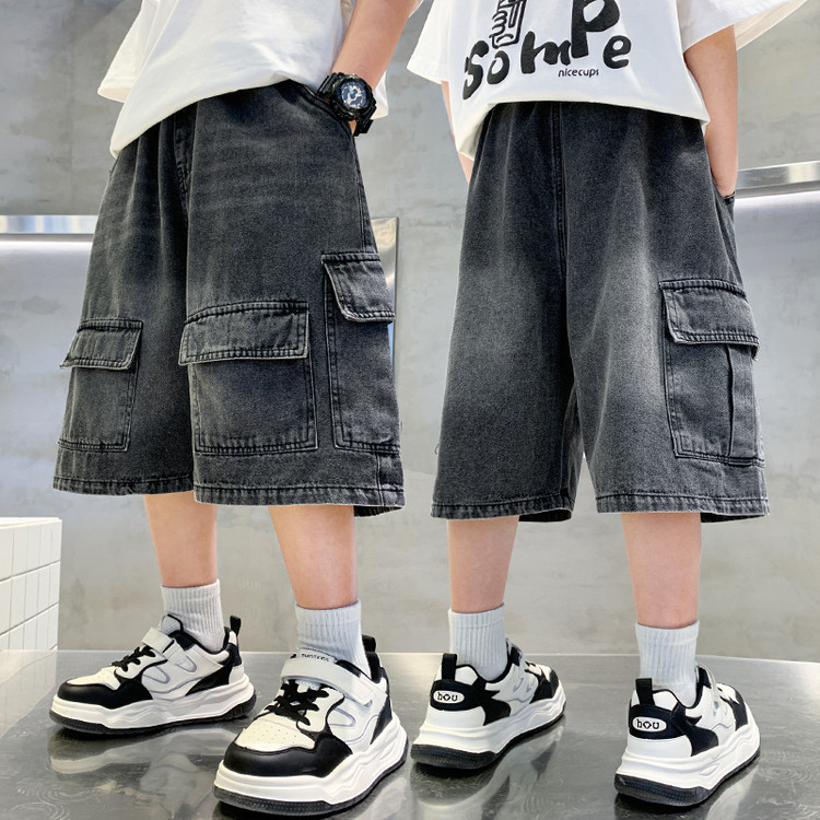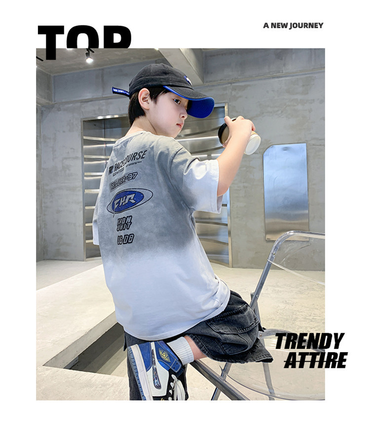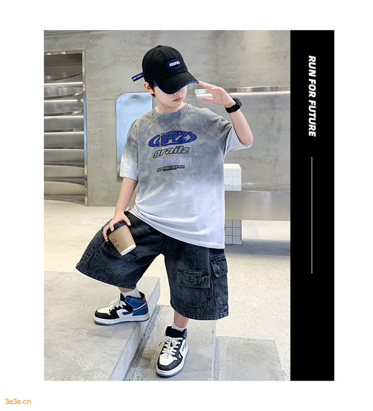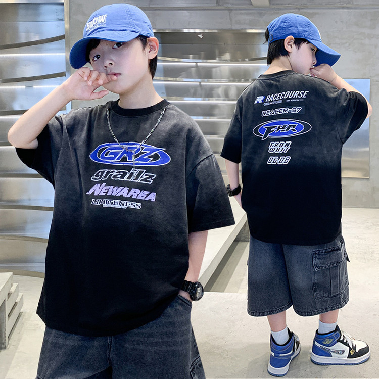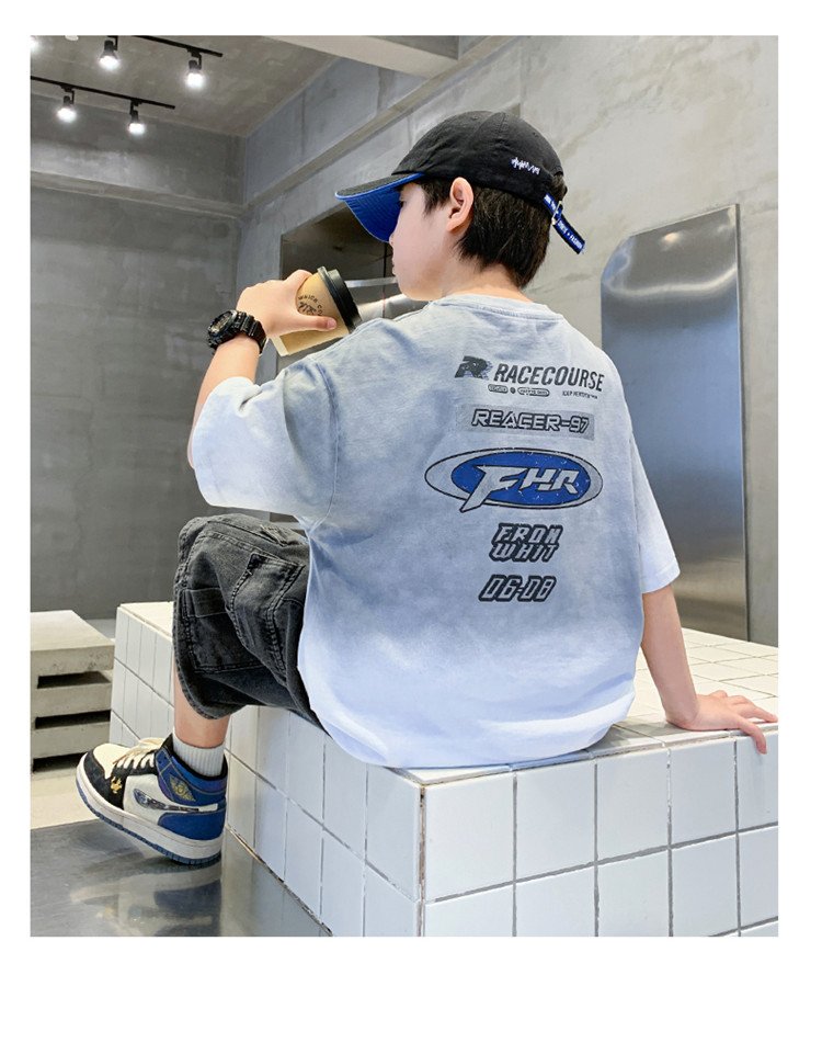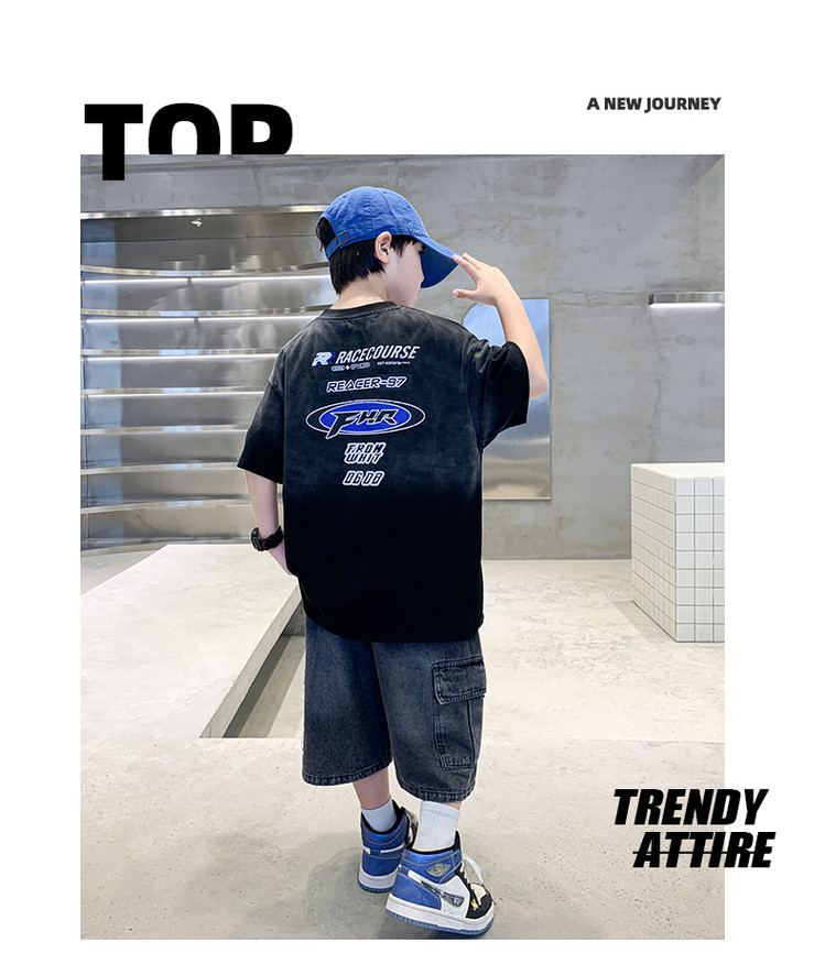대외 무역 트렌디하고 멋진 아동복 소년 여름 반팔 양복 패셔너블 데님 카고 반바지 타이 염색 티셔츠 투피스 세트스토어 가기