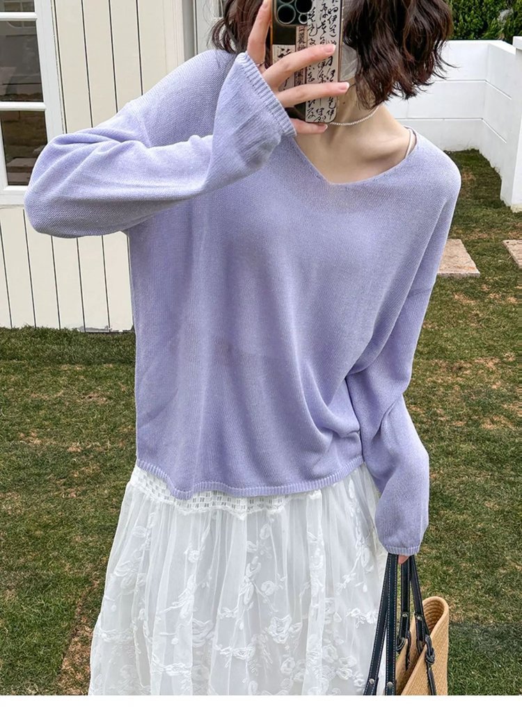 섬 진쿠와 종이 원사 크루 넥 V 넥 스웨터 여성의 얇은 느슨한 스키니 선 스크린 블라우스 풀러베이스 셔츠