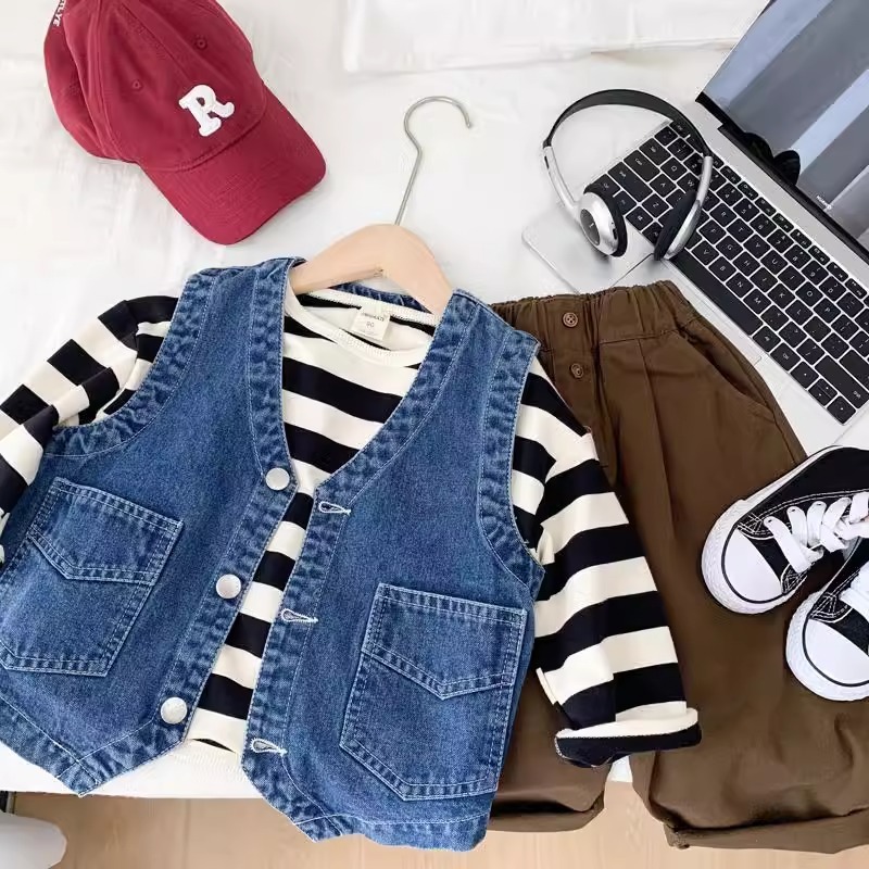 어린이 데님 조끼 2025 새로운 봄, 가을 얇은 스타일 아기 소녀 유행 겉옷 조끼 소년 잘 생긴 양복 조끼스토어 가기