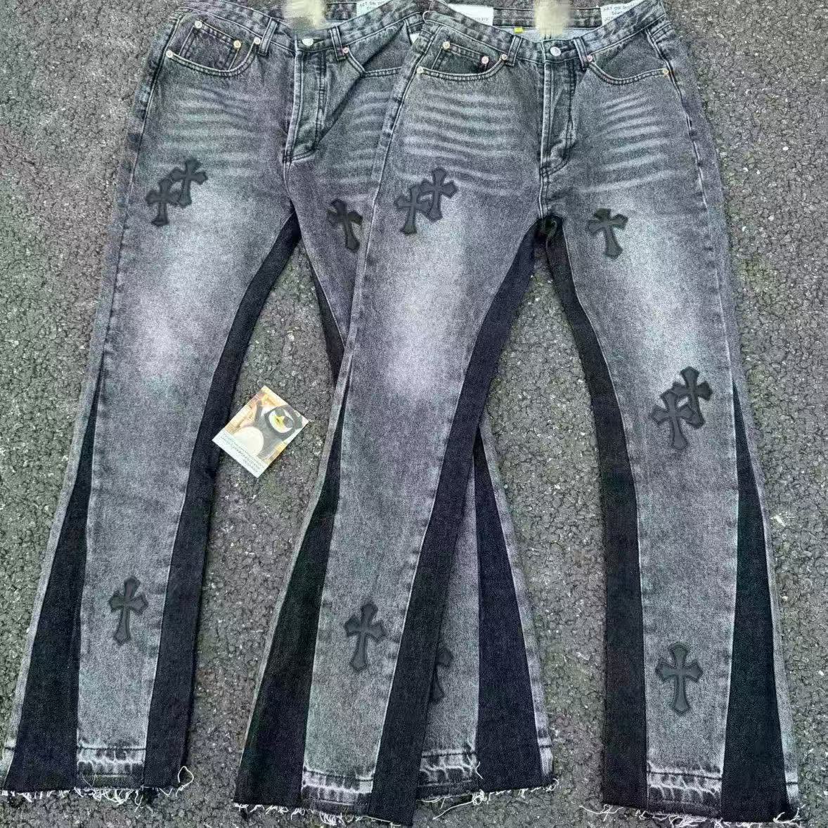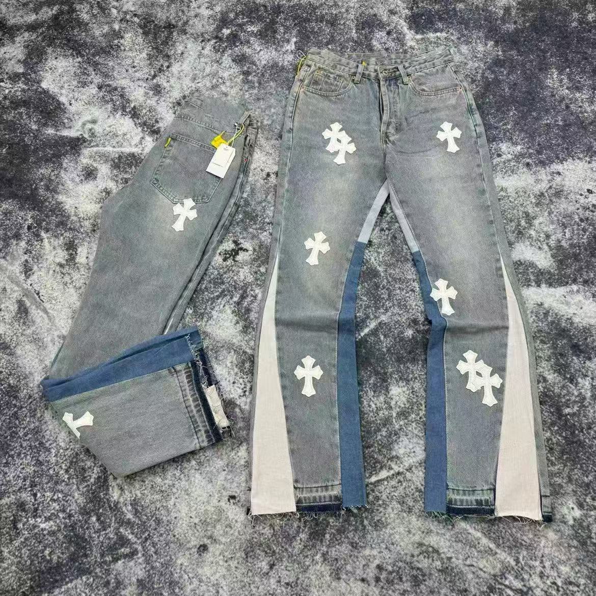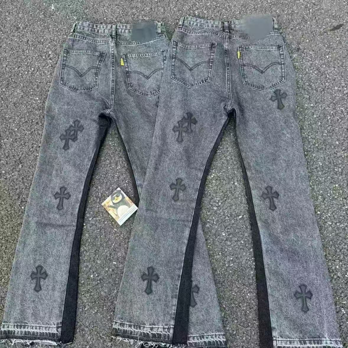 CH 트렌디 한 브랜드 새로운 빈티지 가죽 크로스 라벨 데님 플래 팬츠는 오래 된 스티칭 청바지 하이 스트리트 팬츠를 씻었습니다.