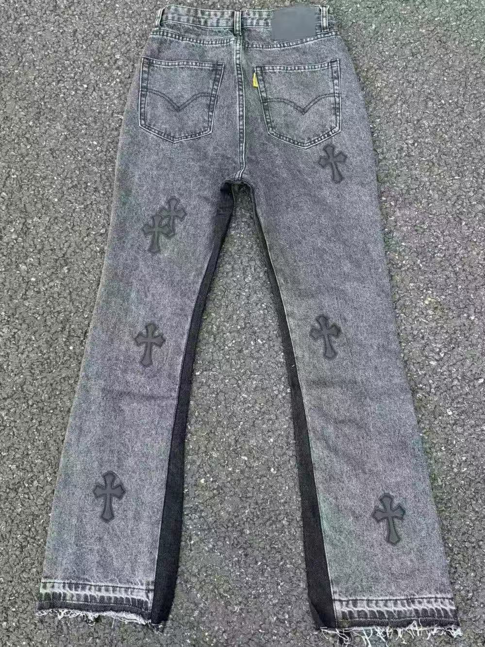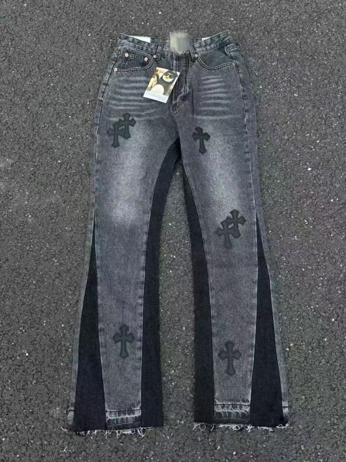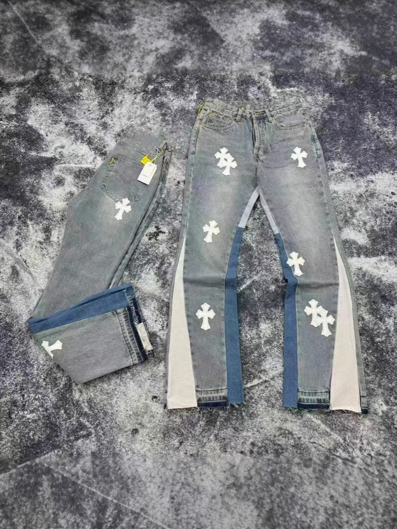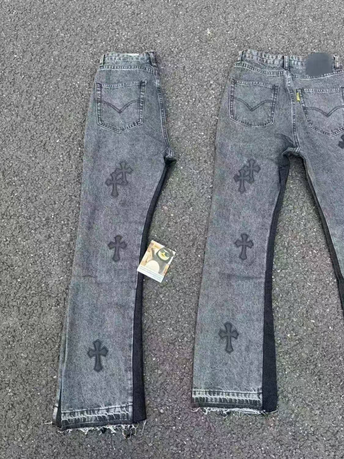 CH 트렌디 한 브랜드 새로운 빈티지 가죽 크로스 라벨 데님 플래 팬츠는 오래 된 스티칭 청바지 하이 스트리트 팬츠를 씻었습니다.