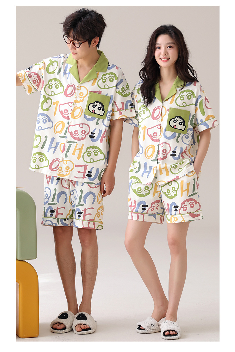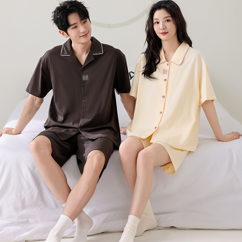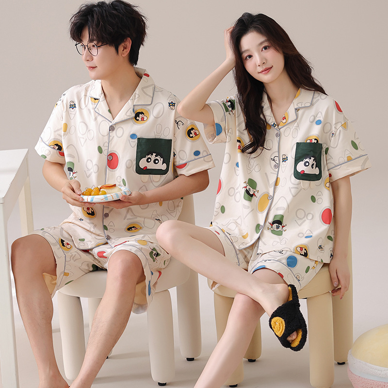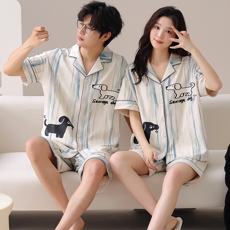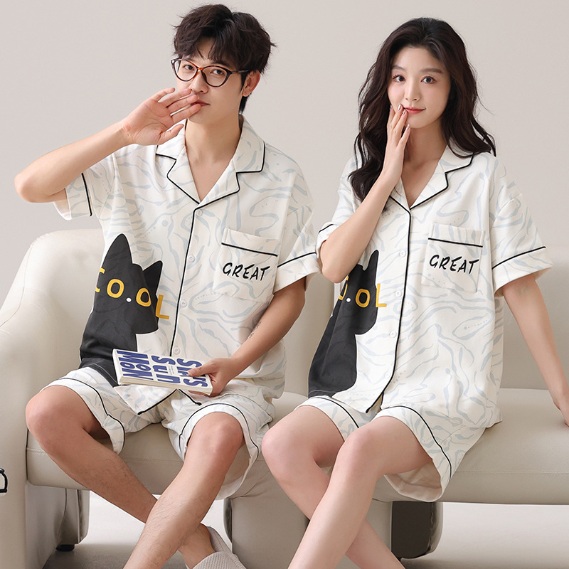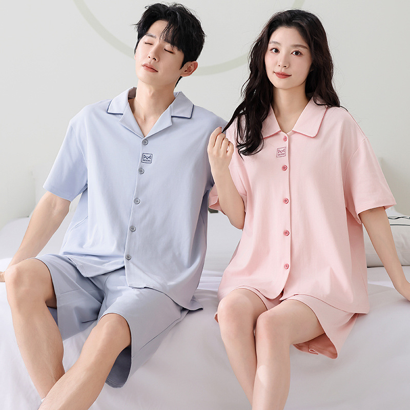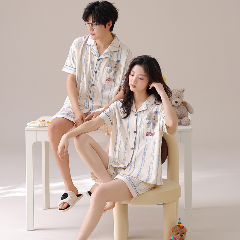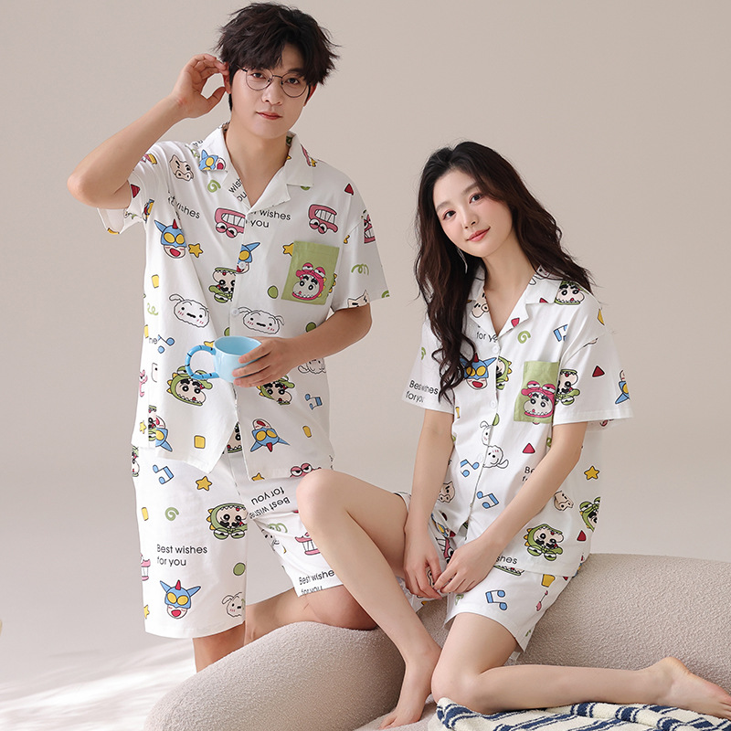 만화 귀여운 퓨어 코튼 옷깃 카디건 커플 파자마 여름 의상 캐주얼 루즈 남성과 여성의 홈 옷스토어 가기