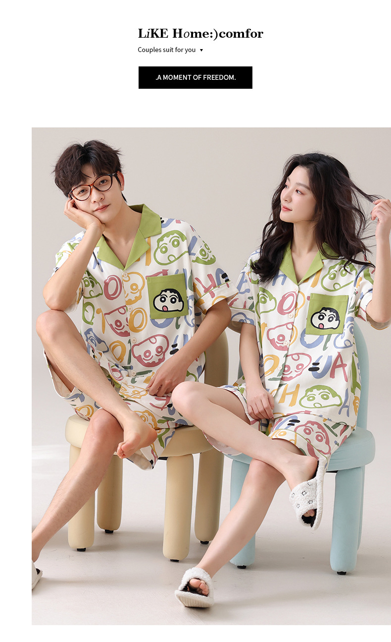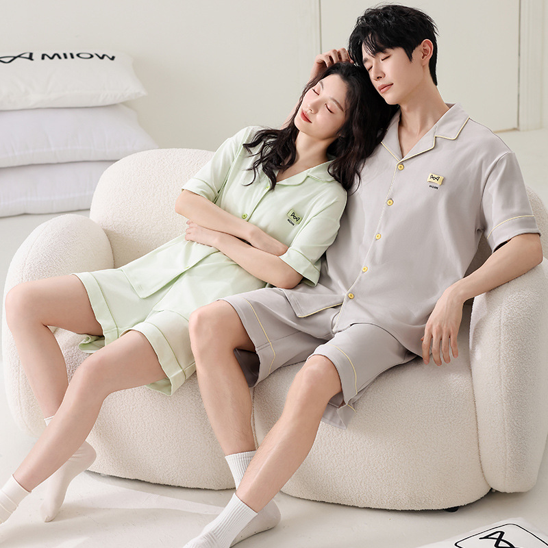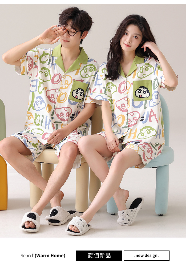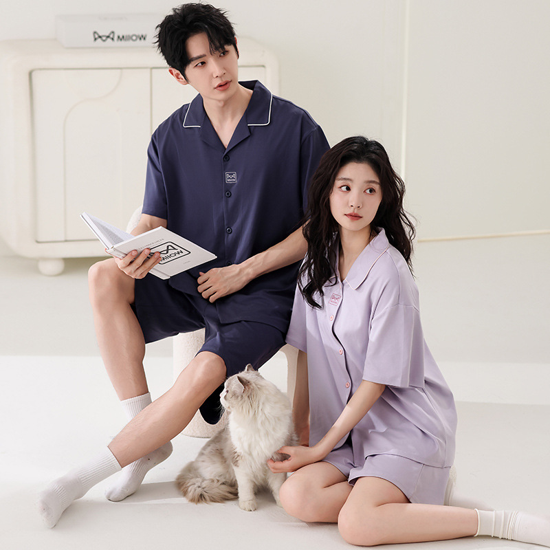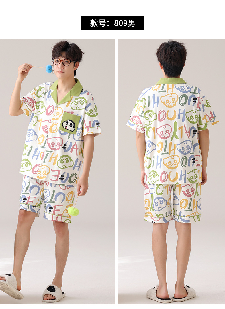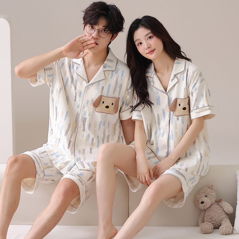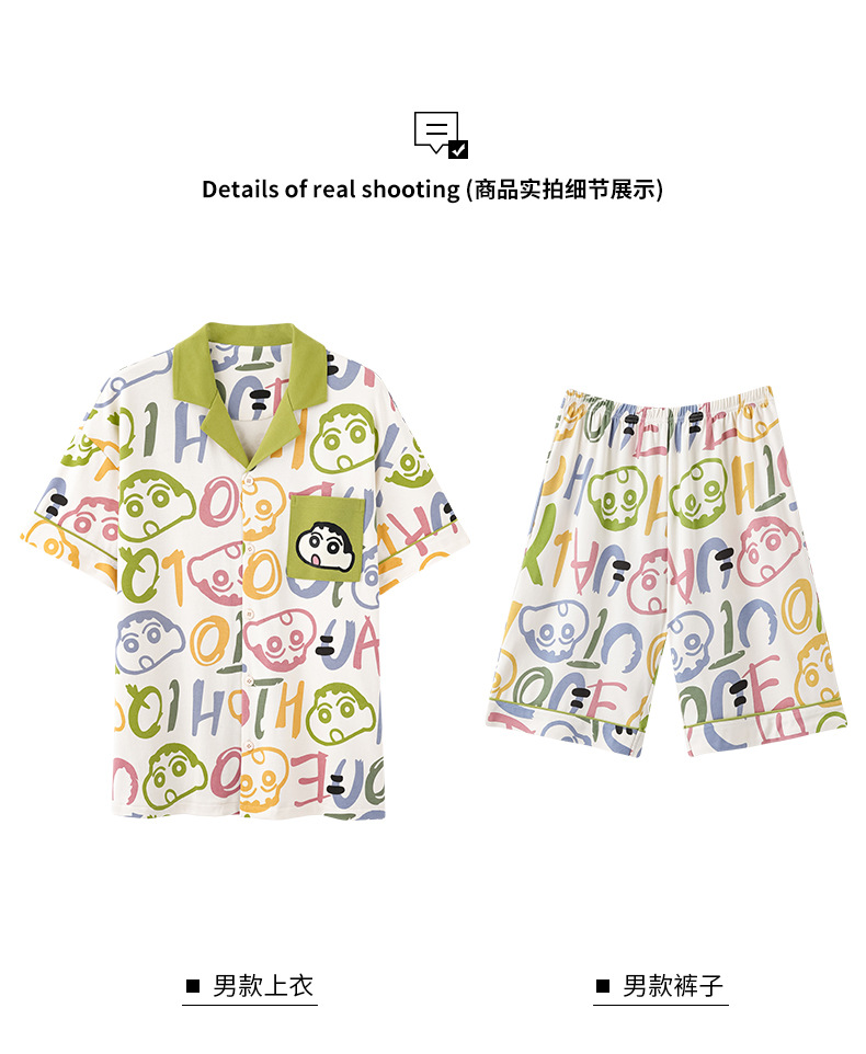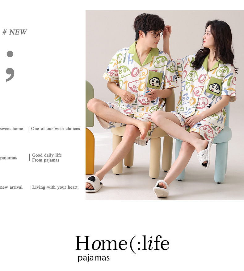 만화 귀여운 퓨어 코튼 옷깃 카디건 커플 파자마 여름 의상 캐주얼 루즈 남성과 여성의 홈 옷스토어 가기