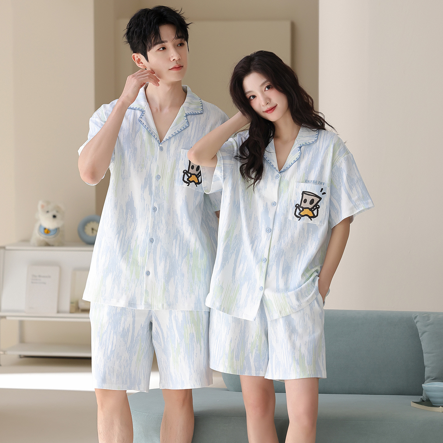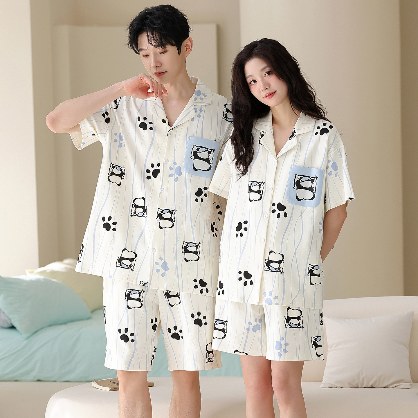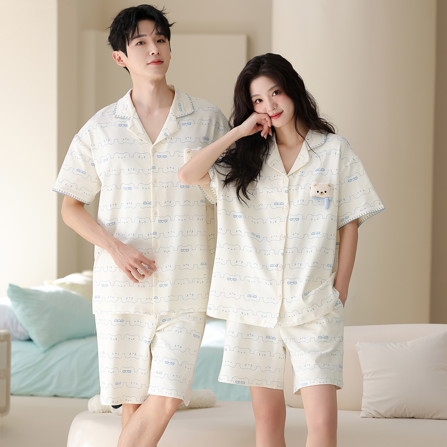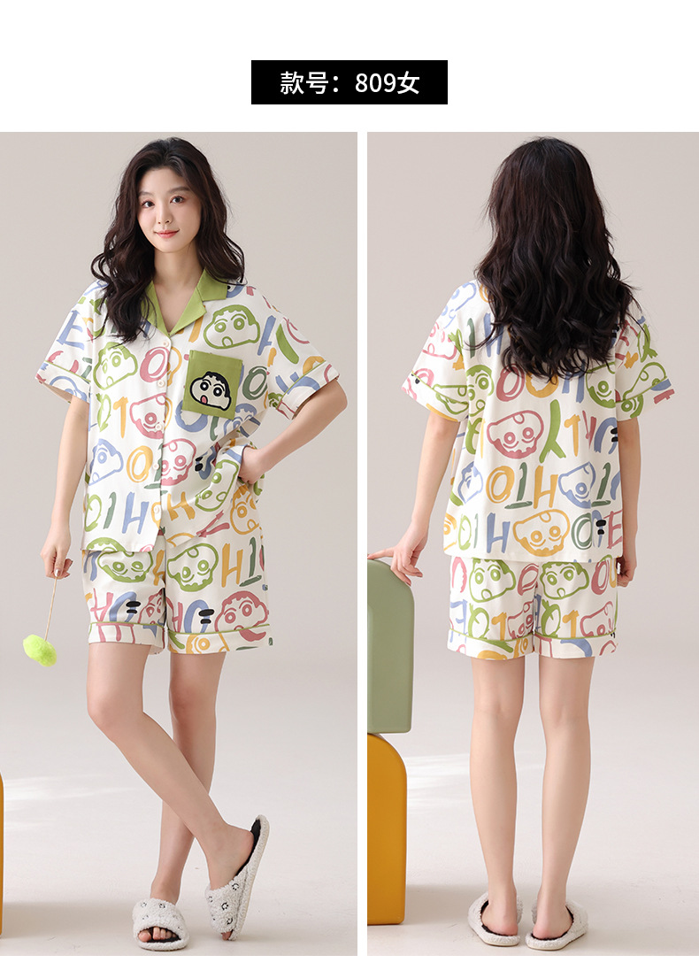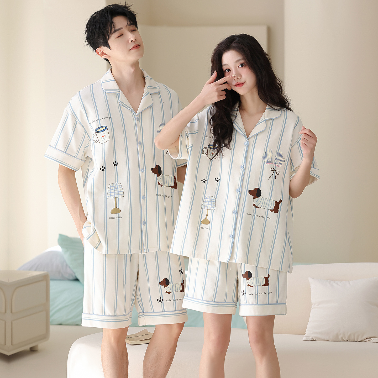 만화 귀여운 퓨어 코튼 옷깃 카디건 커플 파자마 여름 의상 캐주얼 루즈 남성과 여성의 홈 옷스토어 가기