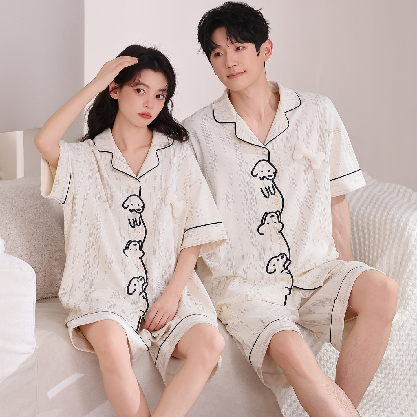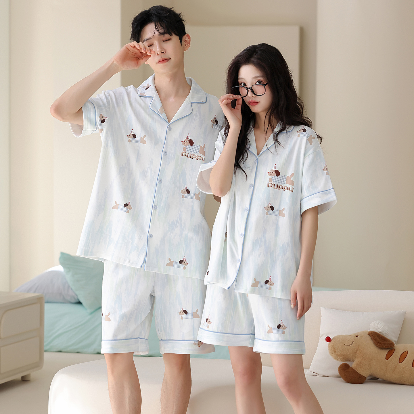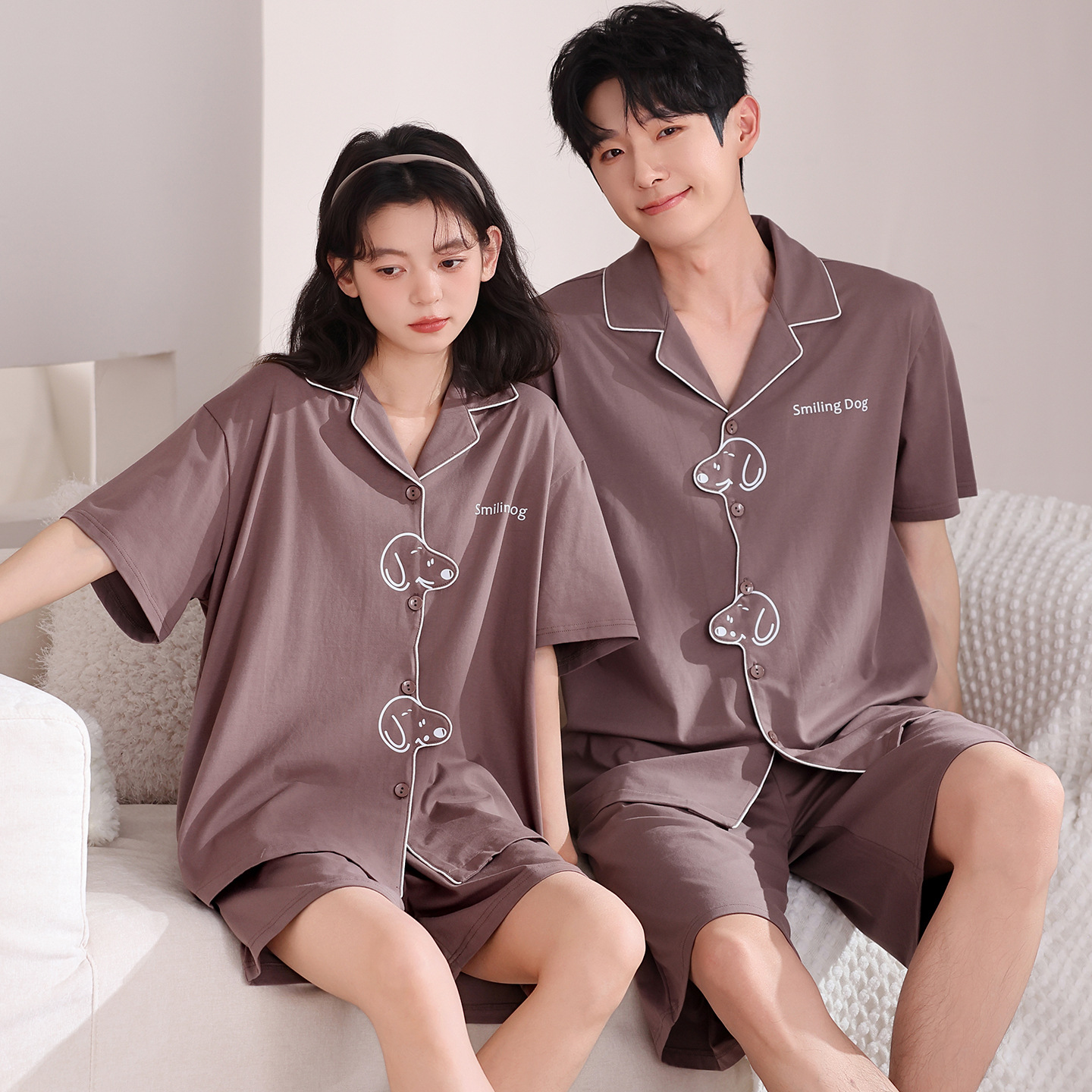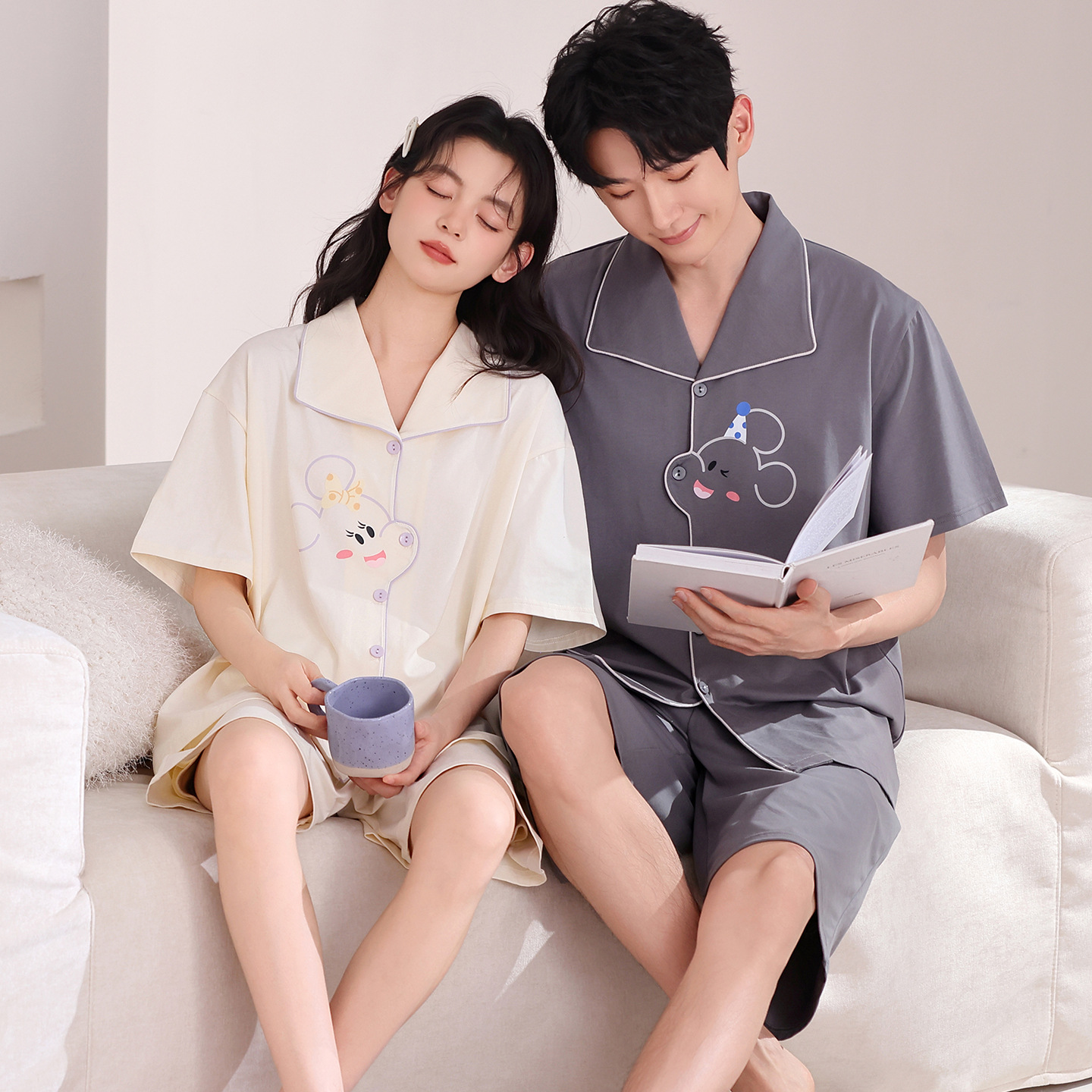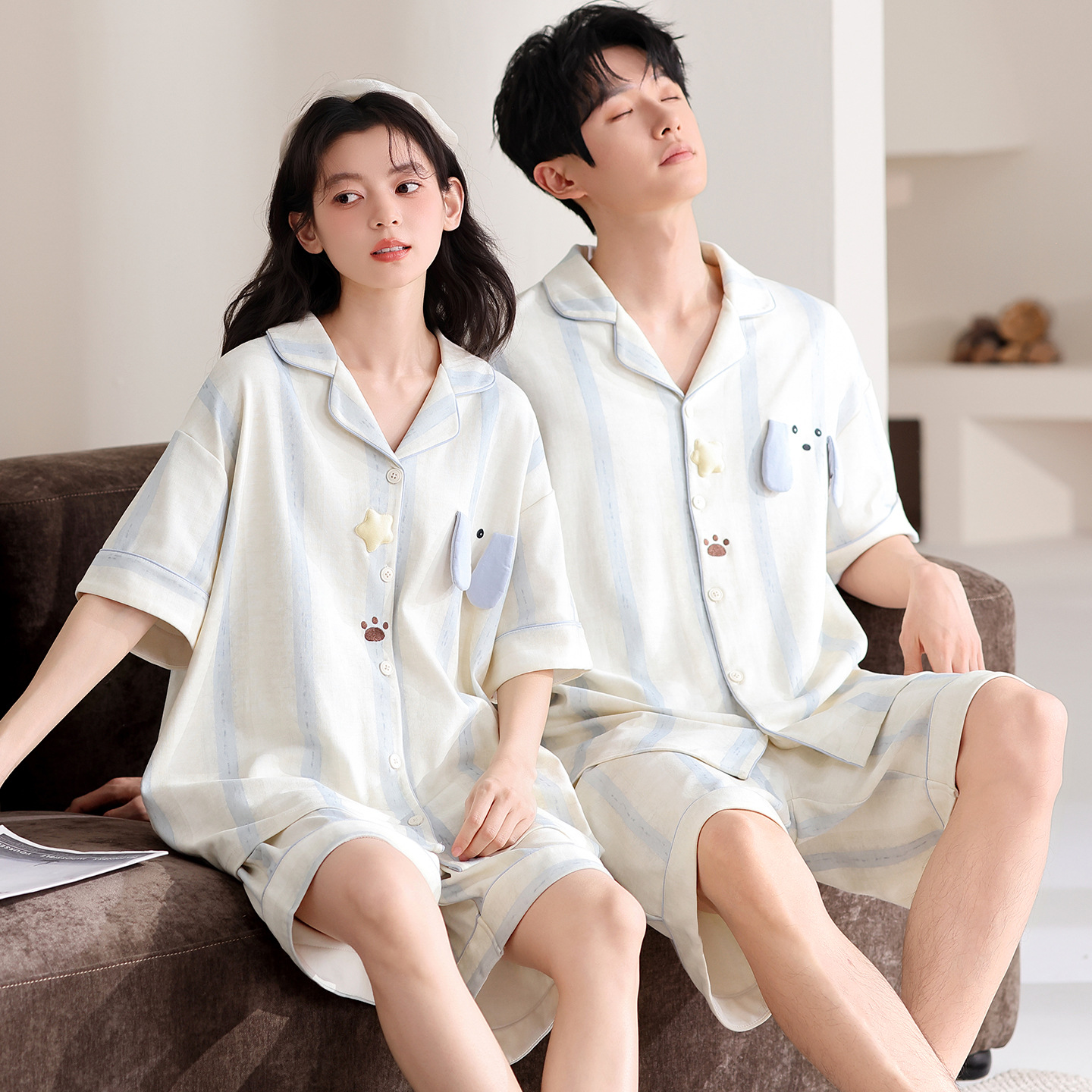 만화 귀여운 퓨어 코튼 옷깃 카디건 커플 파자마 여름 의상 캐주얼 루즈 남성과 여성의 홈 옷스토어 가기