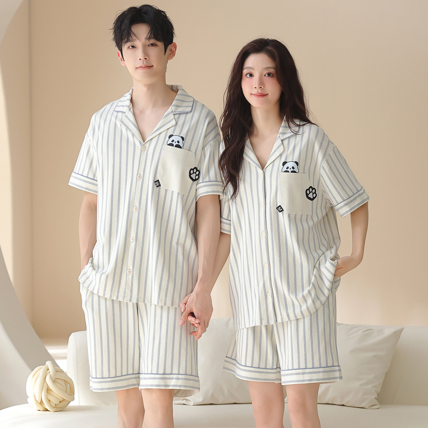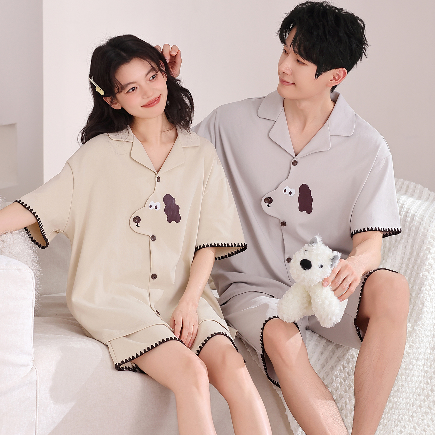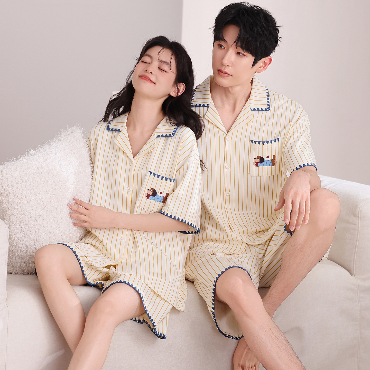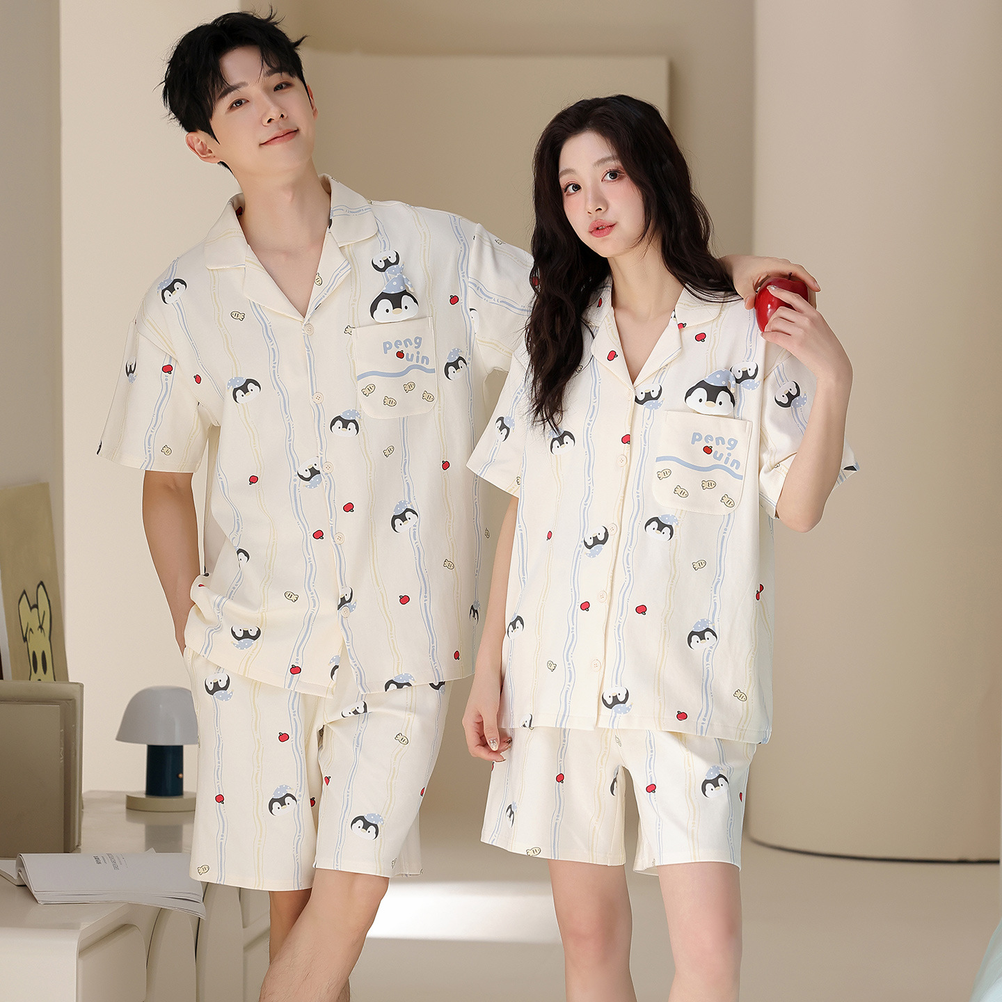만화 귀여운 퓨어 코튼 옷깃 카디건 커플 파자마 여름 의상 캐주얼 루즈 남성과 여성의 홈 옷스토어 가기
